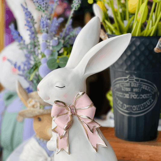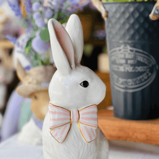 Coelho Com Lacinho Branco e Rosa de Cerâmica 19x13x29cm