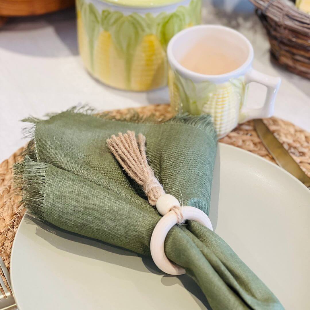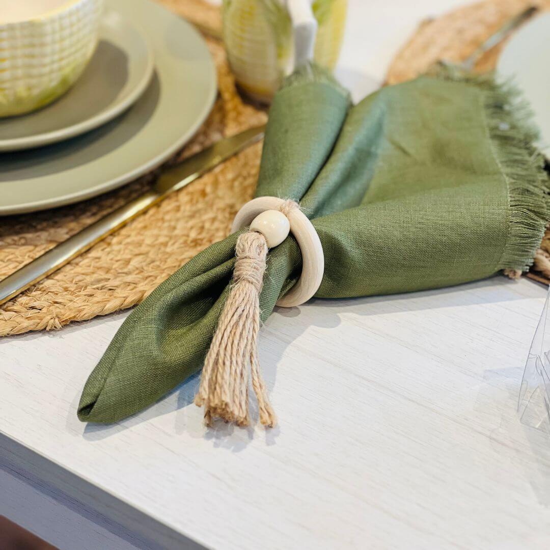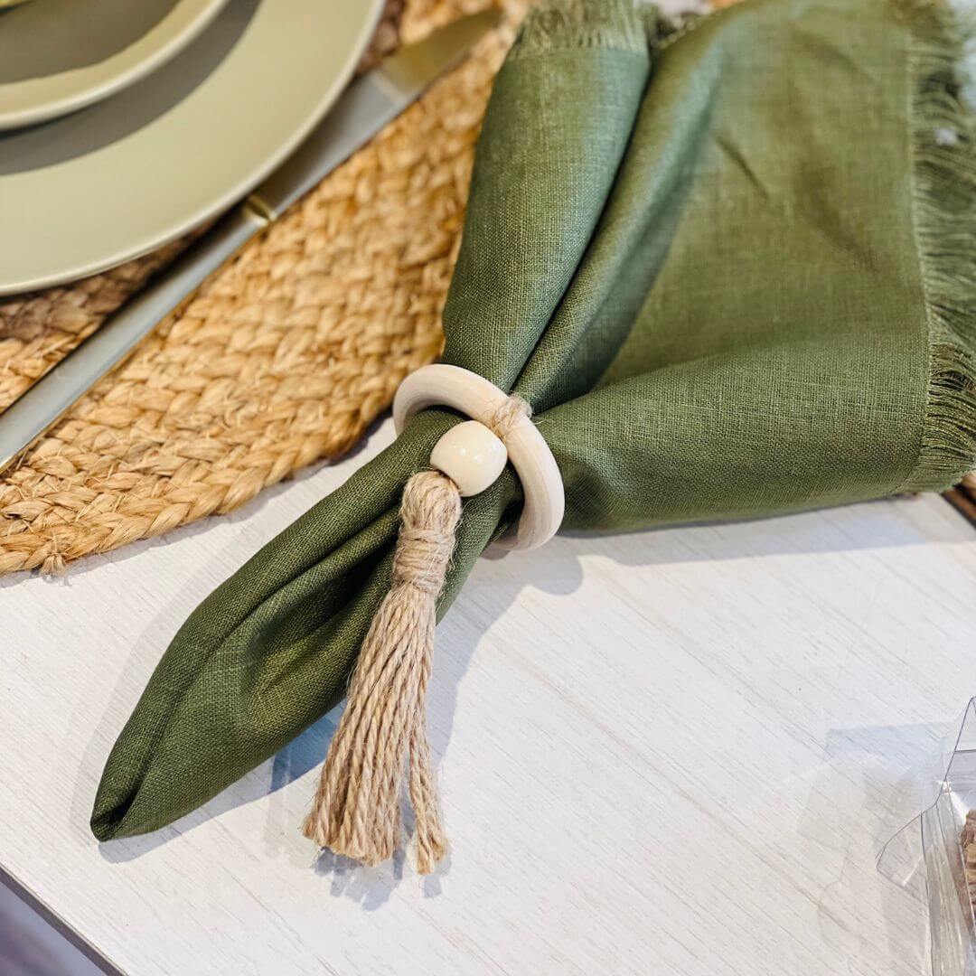 Conjunto de quatro anéis de guardanapo com charmosa aplicação de tassel, ideal para complementar a mesa posta com elegância e um toque artesanal. Perfeito para ocasiões especiais ou para valorização do dia a dia.
