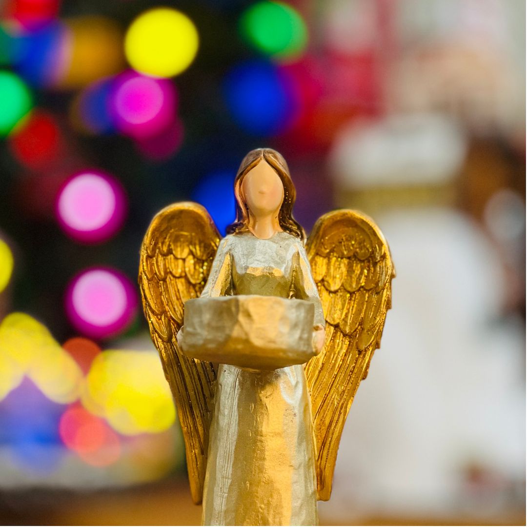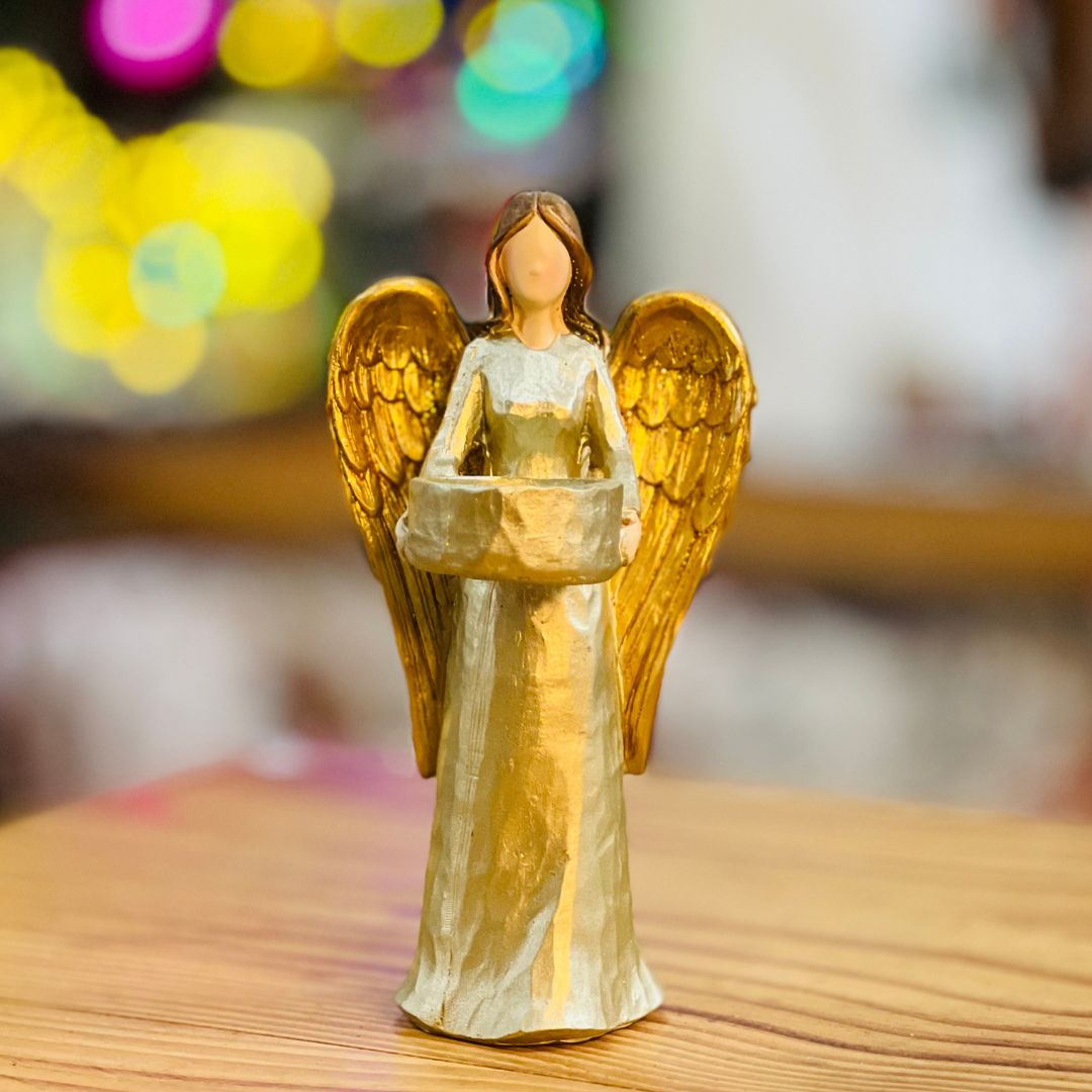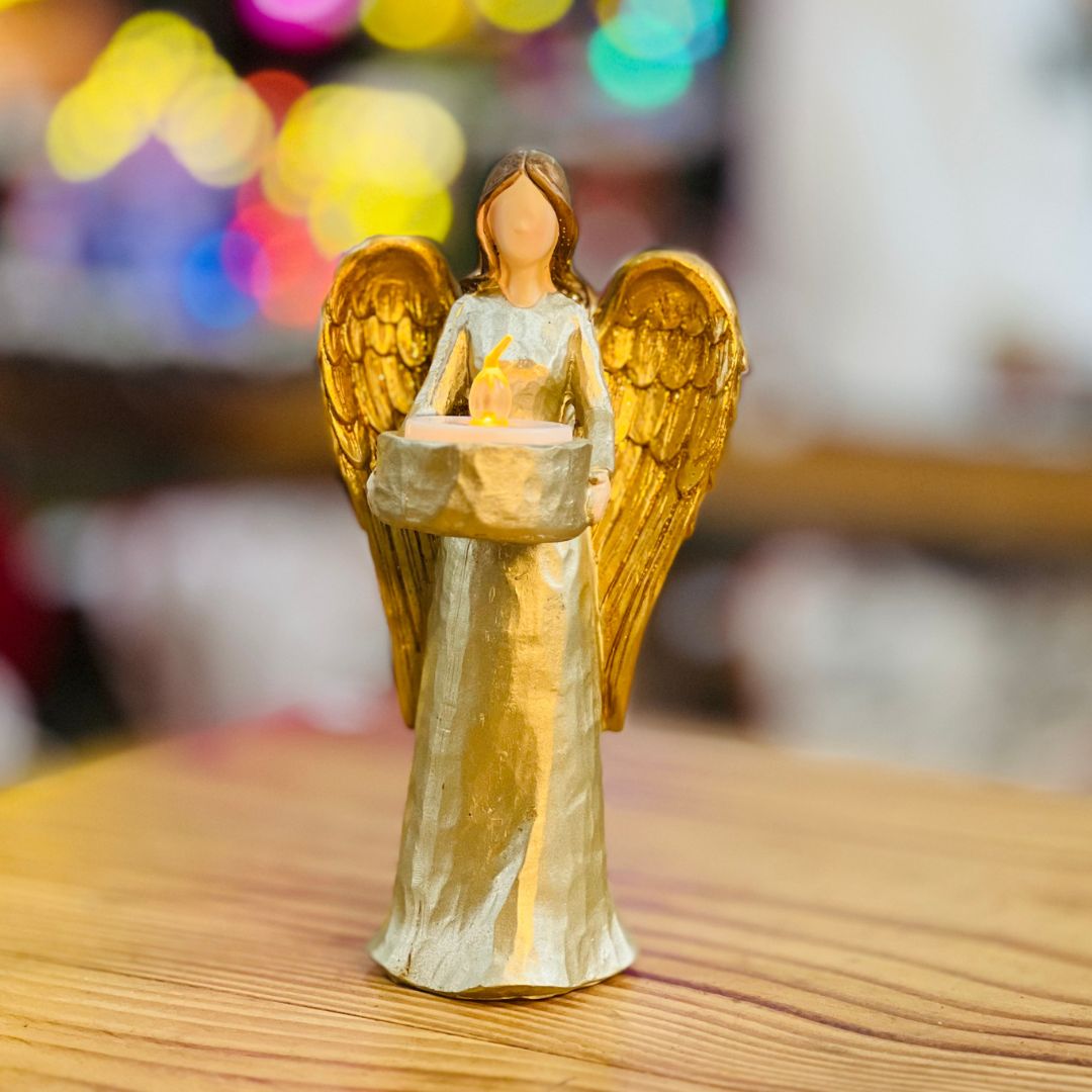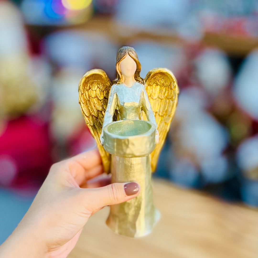 O Anjo em Castiçal Dourado Natal é um elegante enfeite natalino que combina a beleza angelical com a funcionalidade de um castiçal. Este anjo dourado, com detalhes refinados e uma expressão serena, segura uma base para vela, tornando-o perfeito para criar um ambiente acolhedor e iluminado em sua decoração de Natal. Ideal para mesas de jantar, aparadores ou prateleiras, ele traz um toque de paz e luz para as festividades.