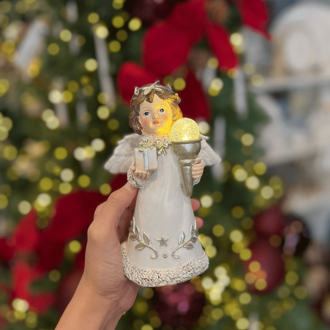 O Anjo Natalino Branco de Resina com LED traz delicadeza e luminosidade para a sua decoração. Com acabamento refinado e iluminação suave, é perfeito para criar um ambiente natalino acolhedor e cheio de paz.