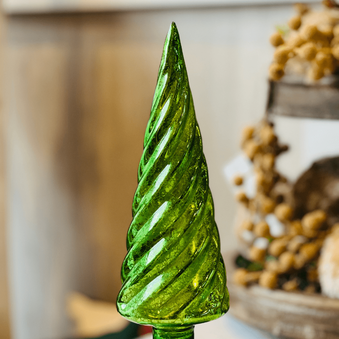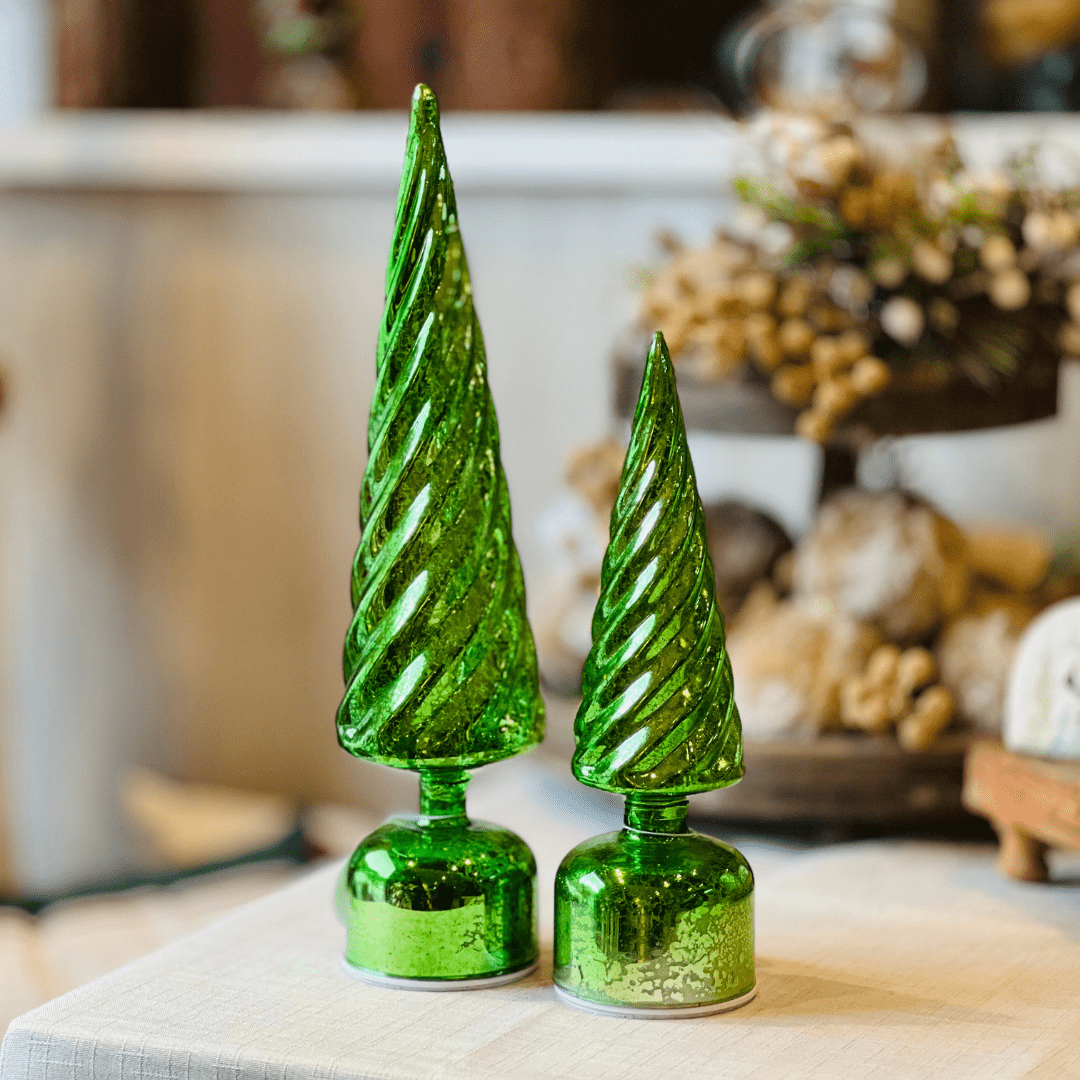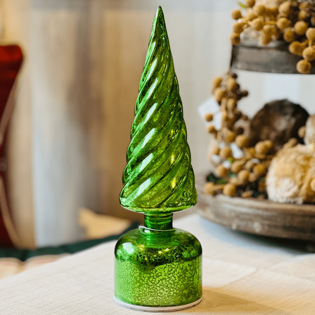 Árvore Natalina de Vidro Giratória com LED Verde – 30cm – Pilha 3AA