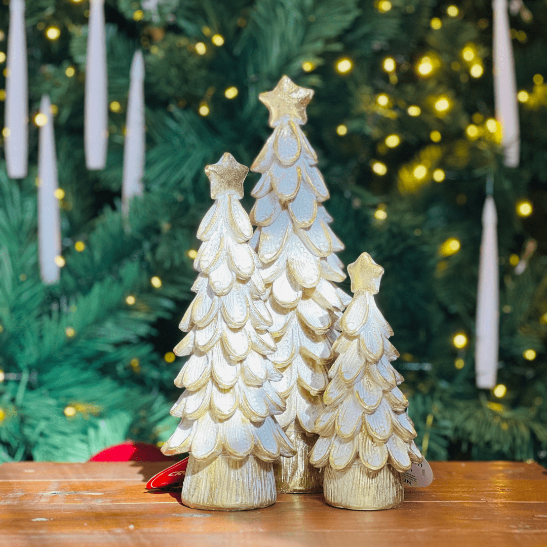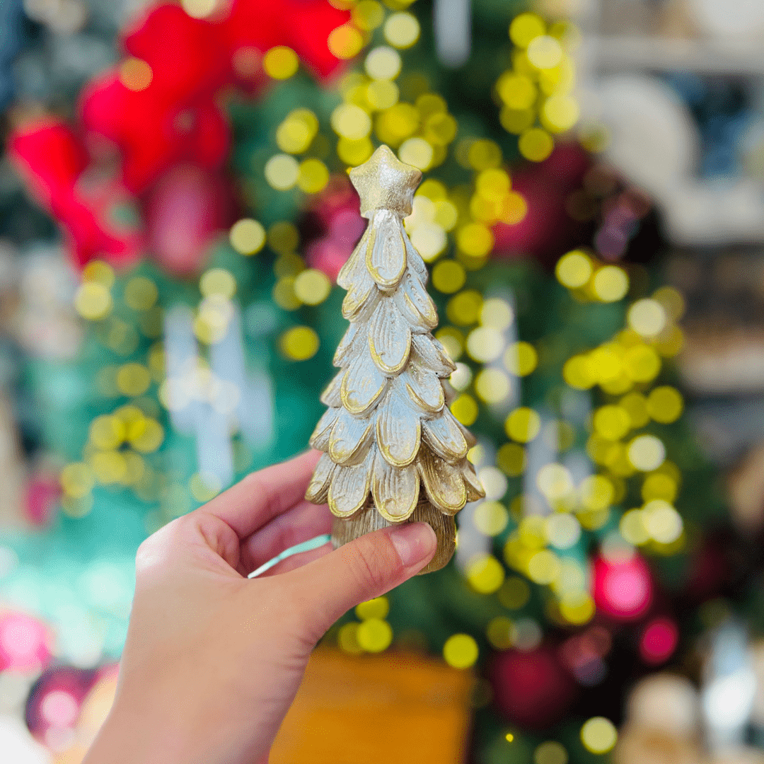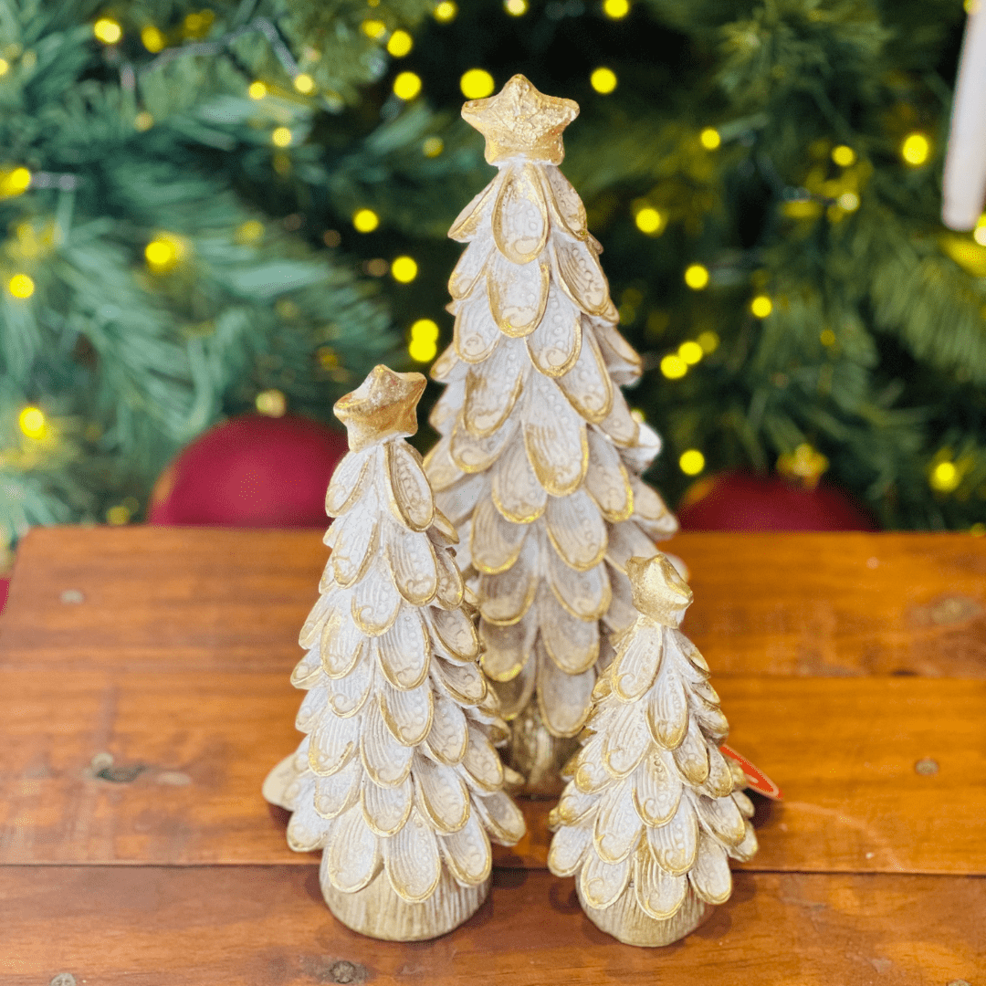 A Árvore Natalina de Resina é uma peça sofisticada que une as cores dourado e branco, trazendo brilho e elegância para a decoração de Natal. Seu acabamento delicado e detalhes refinados tornam-na ideal para enfeitar mesas, aparadores ou composições temáticas, criando um ambiente festivo e encantador.