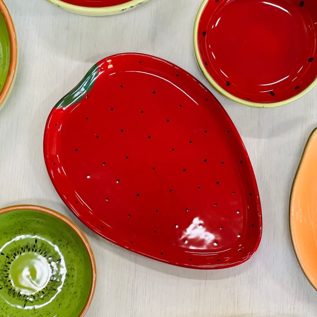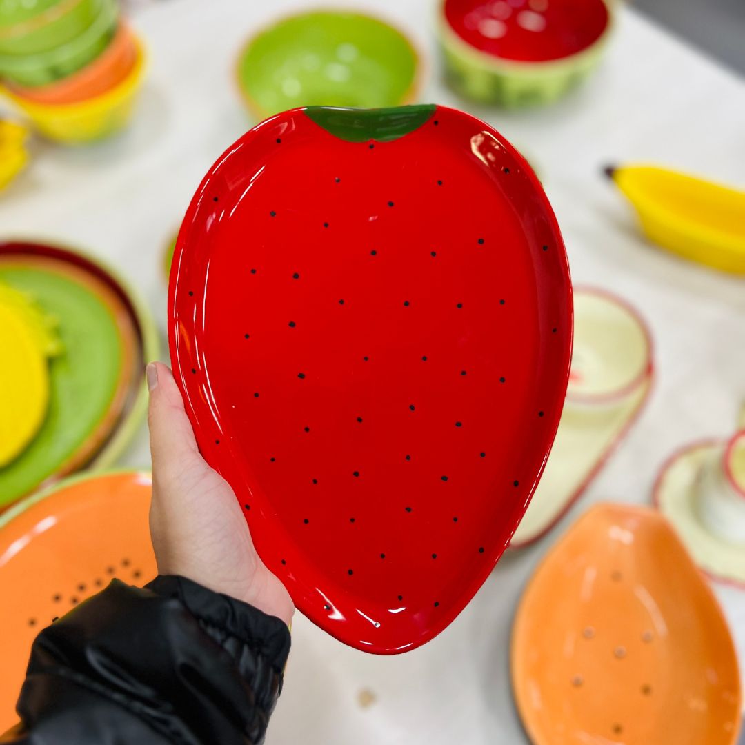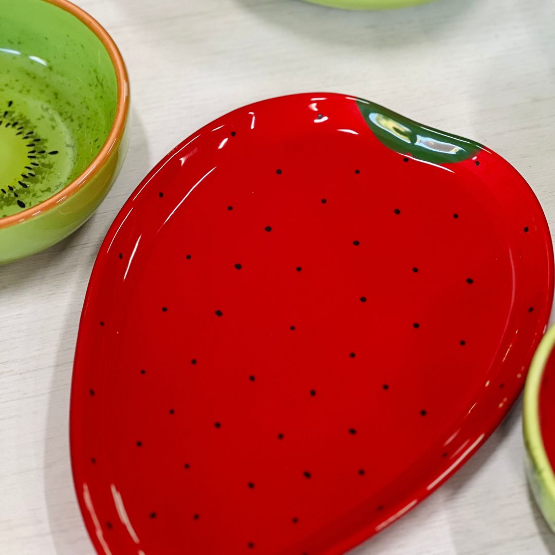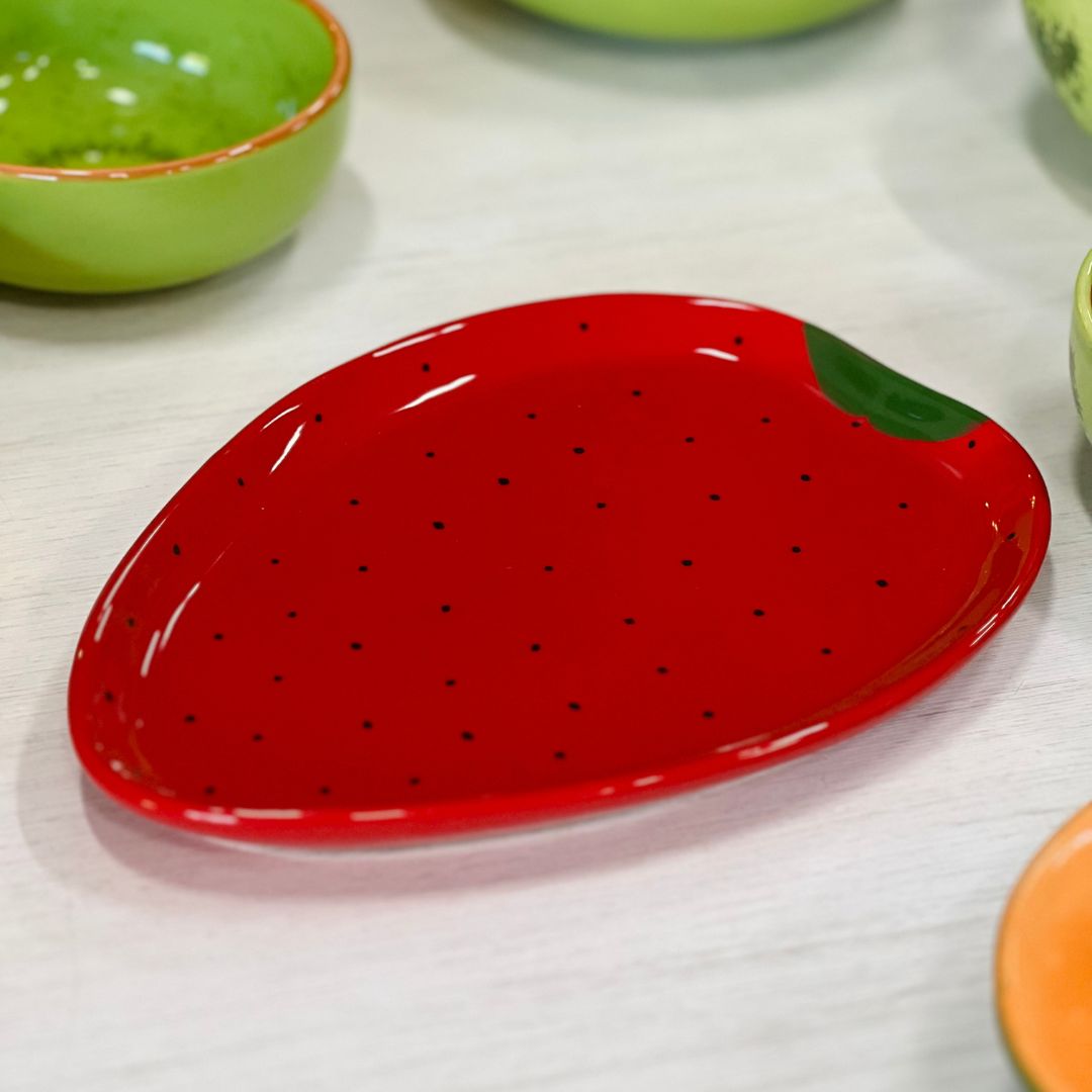 Com formato divertido de morango e cores vibrantes no estilo tutti-frutti, essa bandeja é perfeita para servir petiscos, doces ou compor uma decoração alegre e tropical. Uma peça charmosa que leva cor e criatividade à sua mesa.
