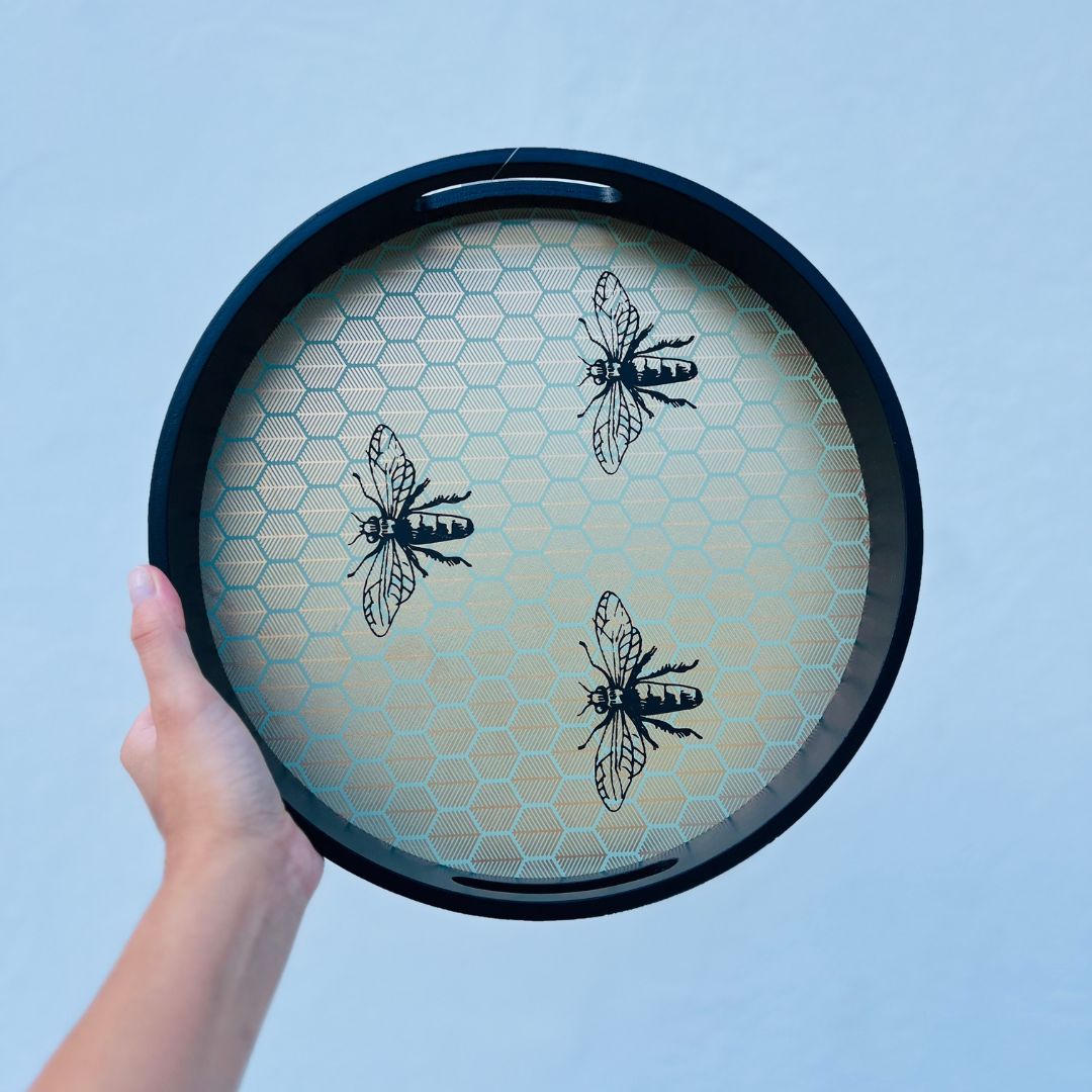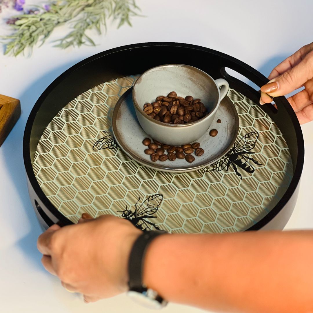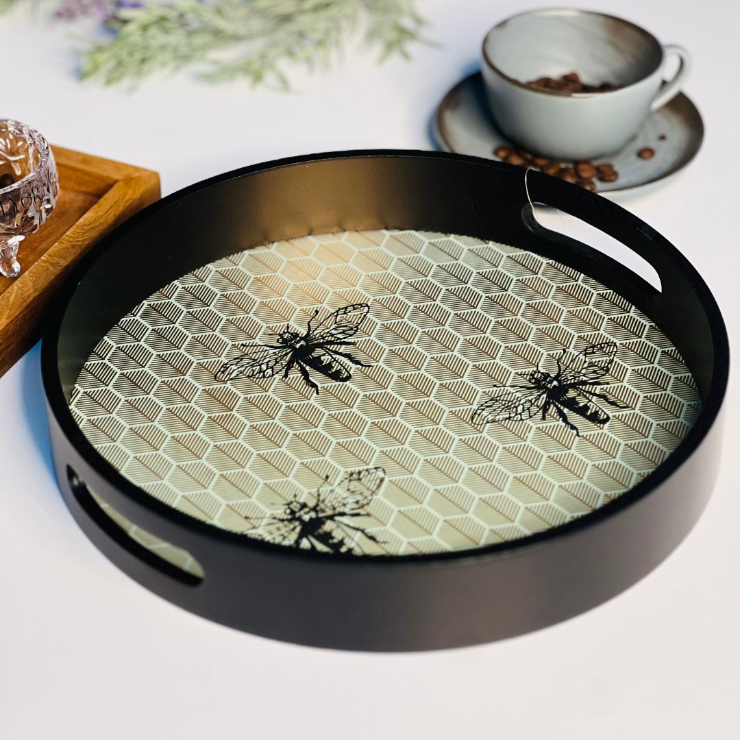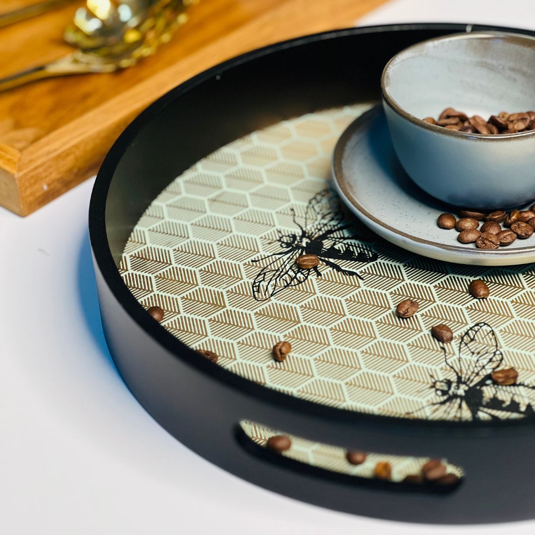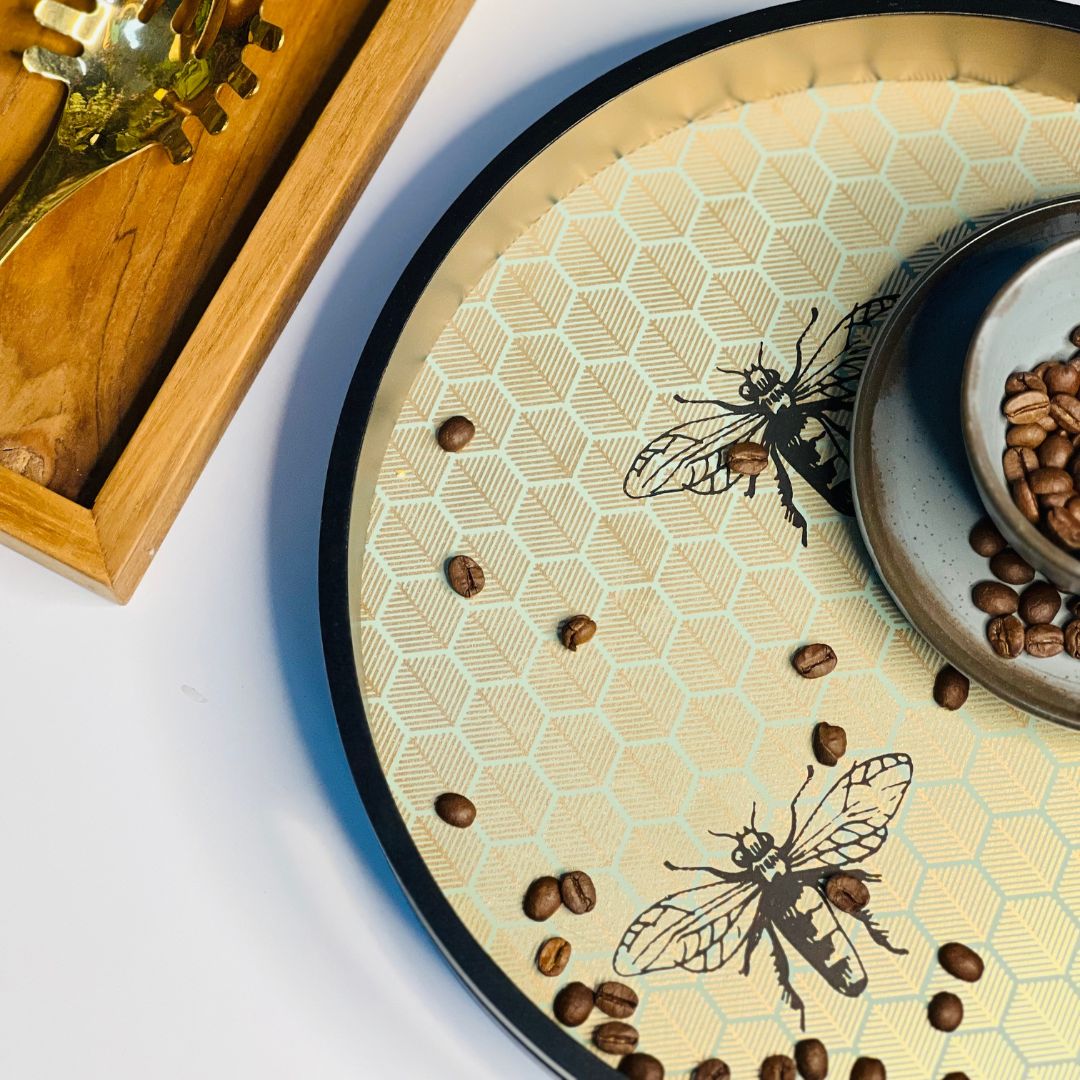 A Bandeja Redonda Be Happy combina funcionalidade e charme para compor a decoração da sua casa. Com design delicado de abelhas, é ideal para servir com elegância ou organizar pequenos objetos, trazendo um toque especial ao ambiente.