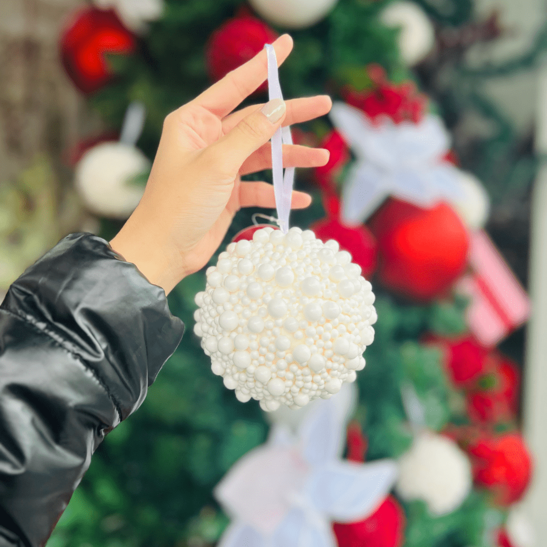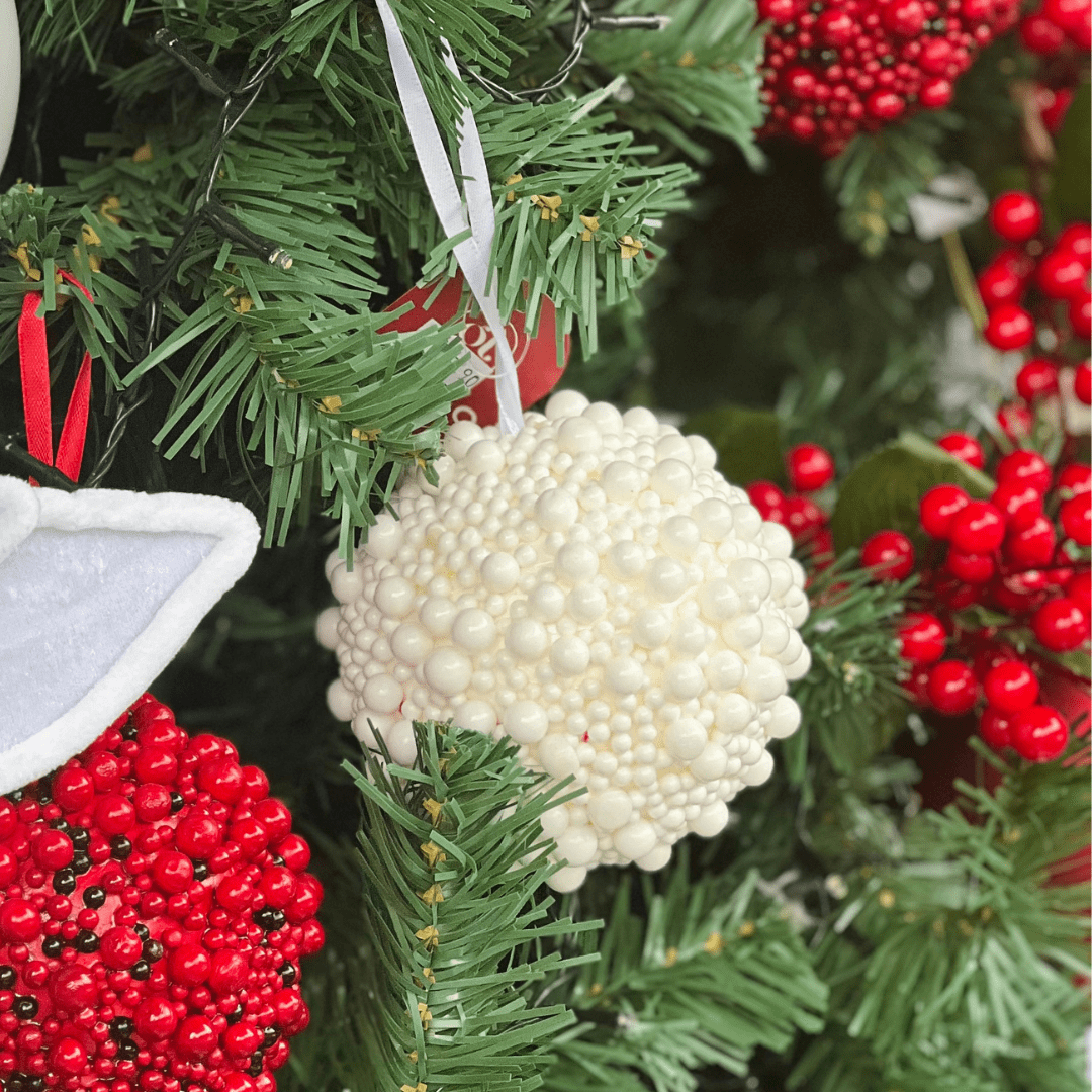 A Bola Natalina Berries Branco traz um toque sofisticado e encantador à sua decoração de Natal. Seu design com pequenas berries brancas oferece um visual elegante e natural, perfeito para árvores, guirlandas ou centros de mesa.