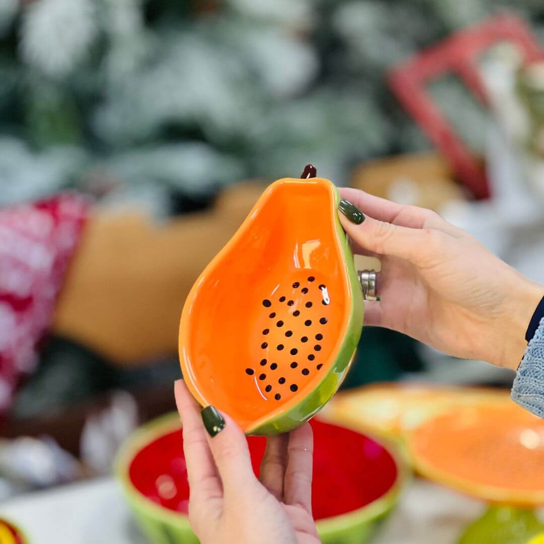 Inspirado no formato e nas cores do mamão, esse bowl no estilo tutti-frutti é perfeito para servir frutas, sobremesas ou complementar a decoração com um toque tropical e divertido. Uma peça criativa que traz charme e leveza à mesa.