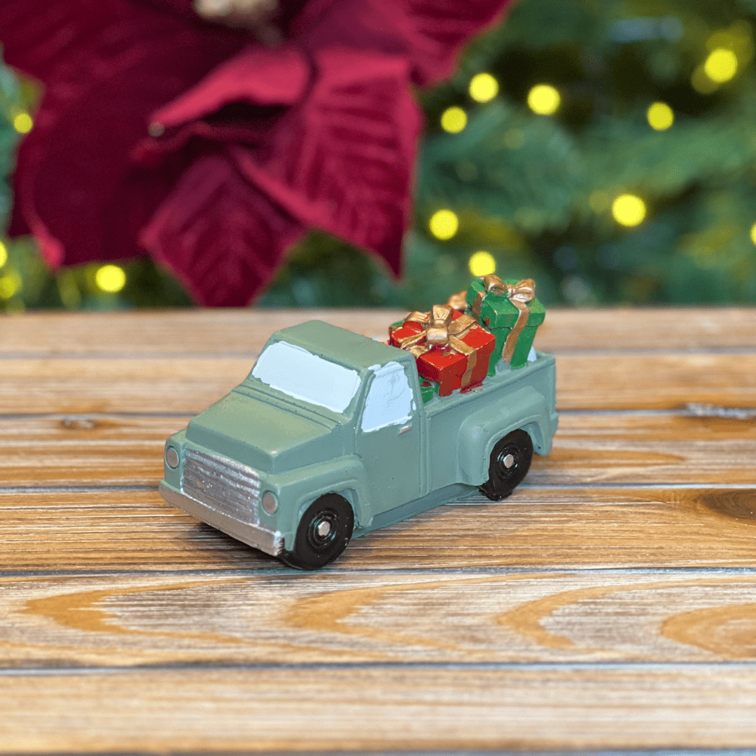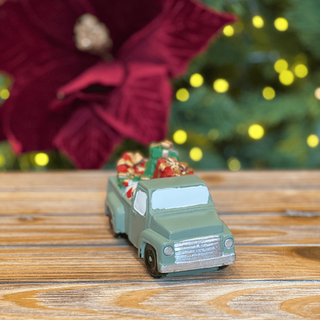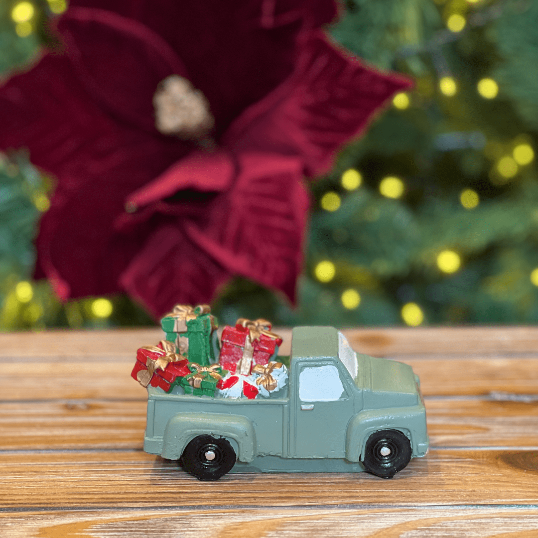 Caminhonete Natalina Verde de Resina 13x5,9x6,9cm