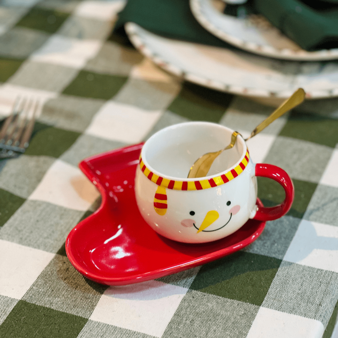 Encante-se com esta caneca temática de Natal em formato de boneco de neve, acompanhada de pires em formato de bota e colher. Com design lúdico e detalhes delicados, é perfeita para servir bebidas quentes, decorar mesas festivas ou presentear com estilo durante o Natal.