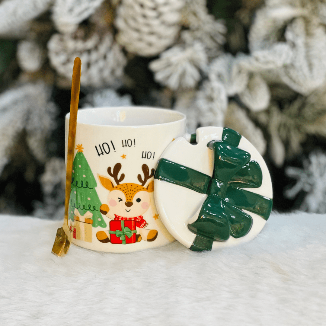 Caneca Natalina Rena Com Colher e Tampa de Cerâmica 300ml