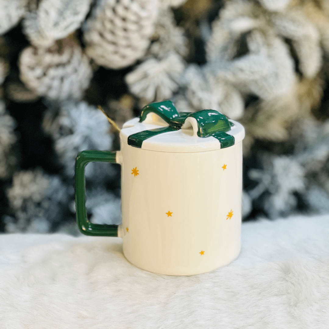Caneca Natalina Rena com Colher e Tampa de Cerâmica 300ml
