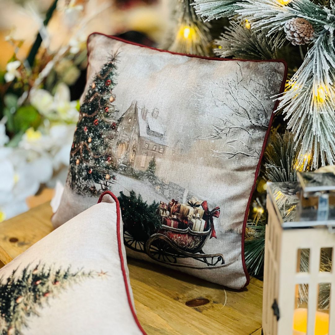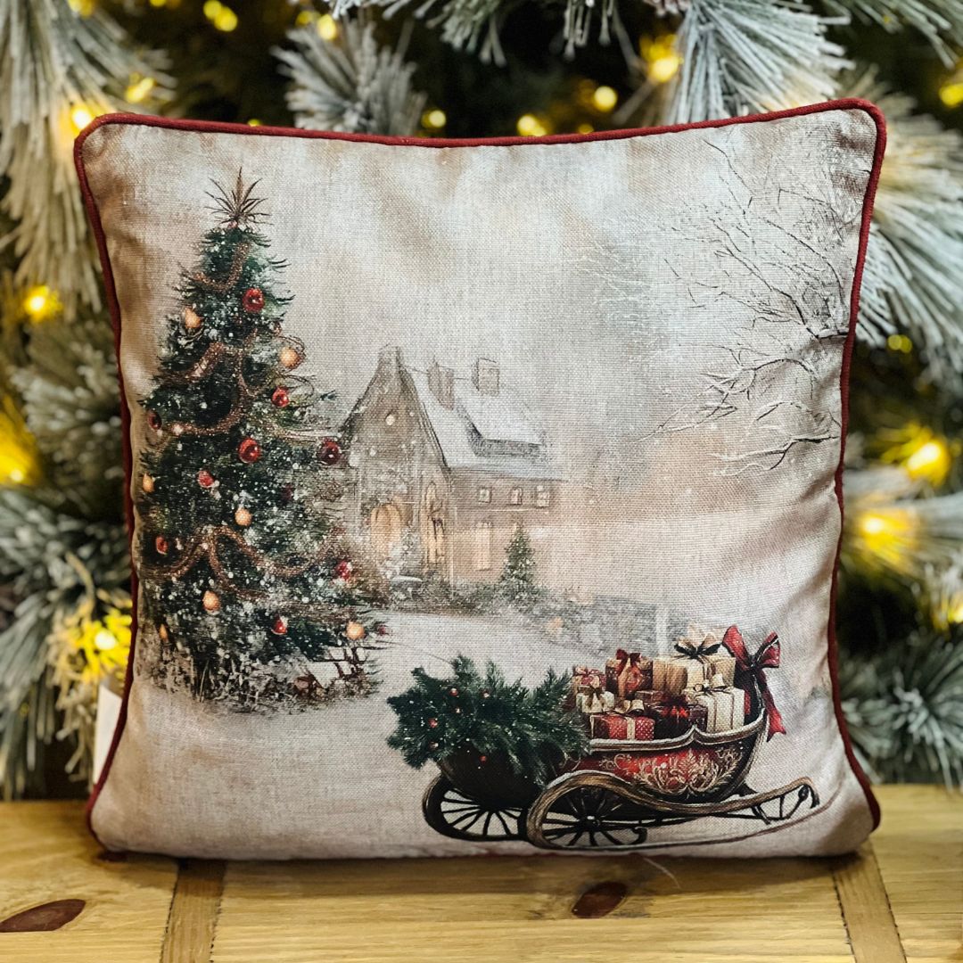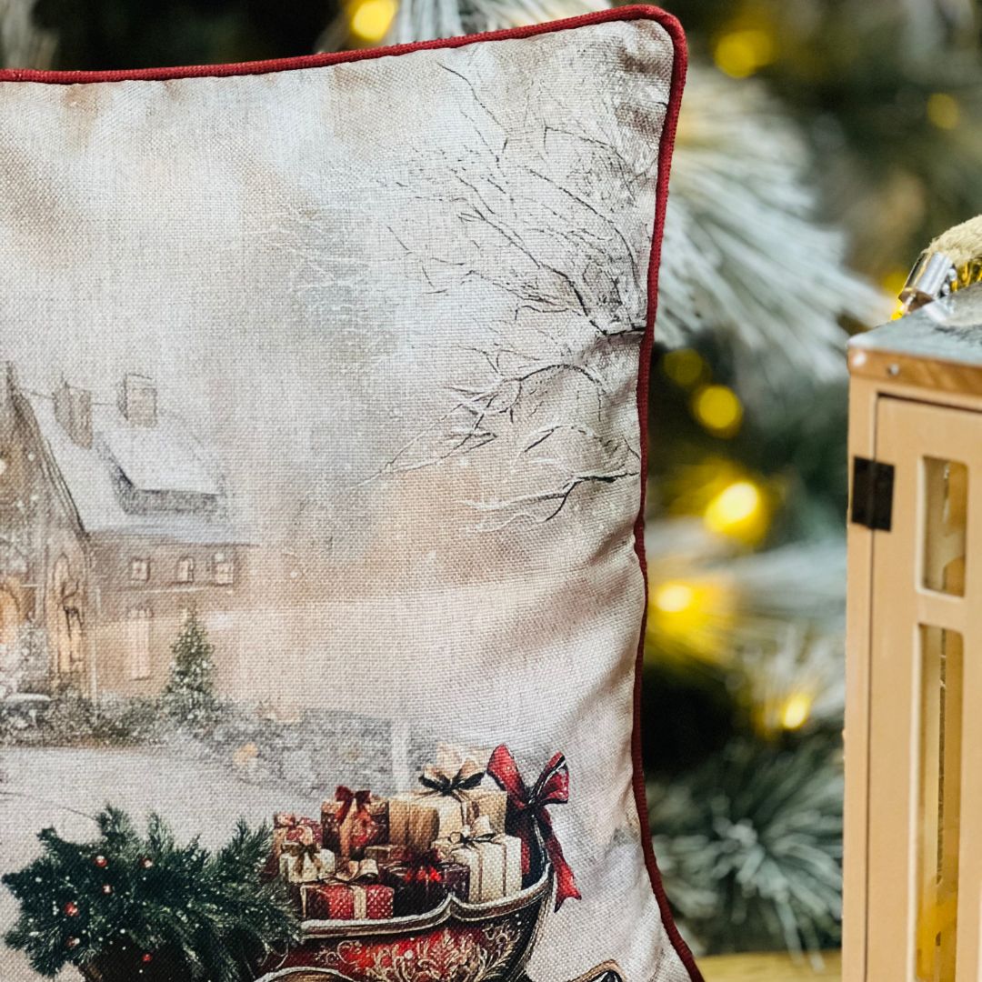 Capa Natalina Cenário Árvore e Trenó com Cordone – 43 cm x 43 cm