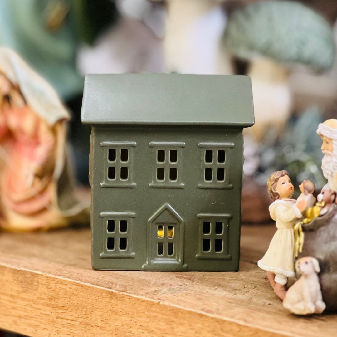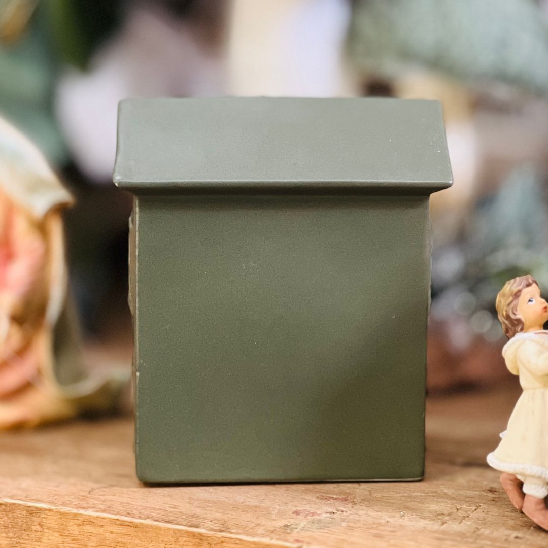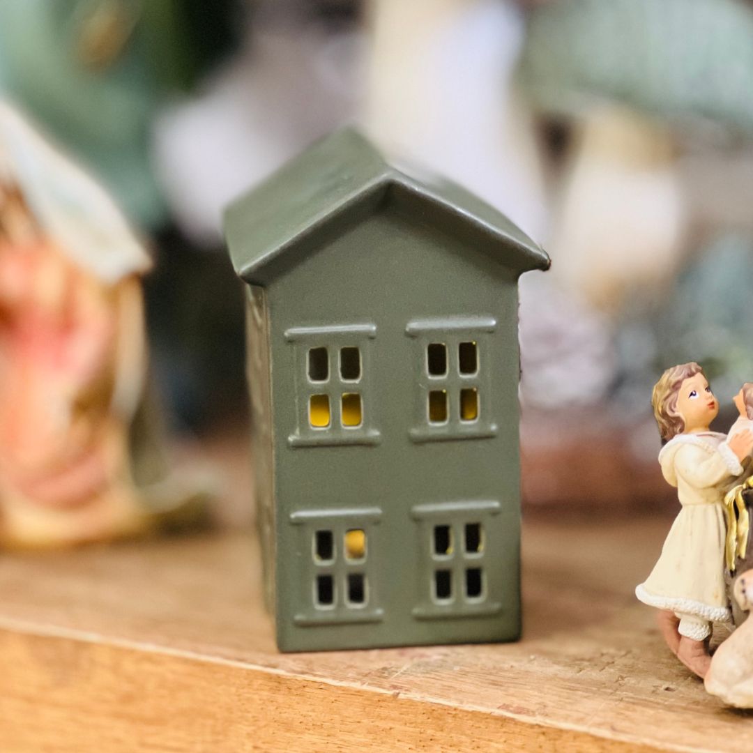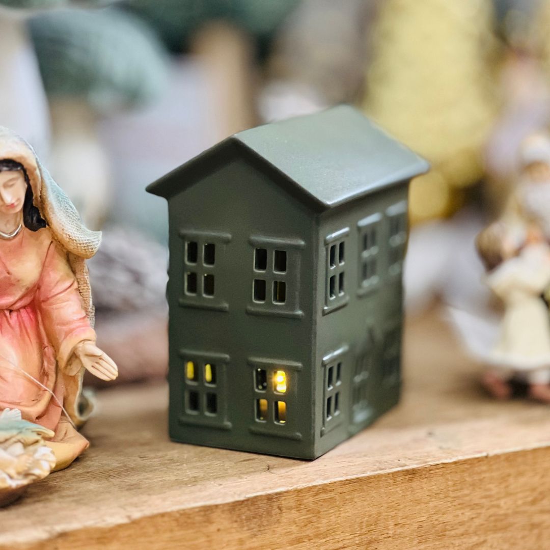 Uma encantadora casa de cerâmica verde com iluminação em LED, ideal para adicionar um toque natalino aconchegante à sua decoração. Seu design detalhado traz uma sensação de vila natalina e é perfeita para compor cenários ou decorar pequenos espaços.