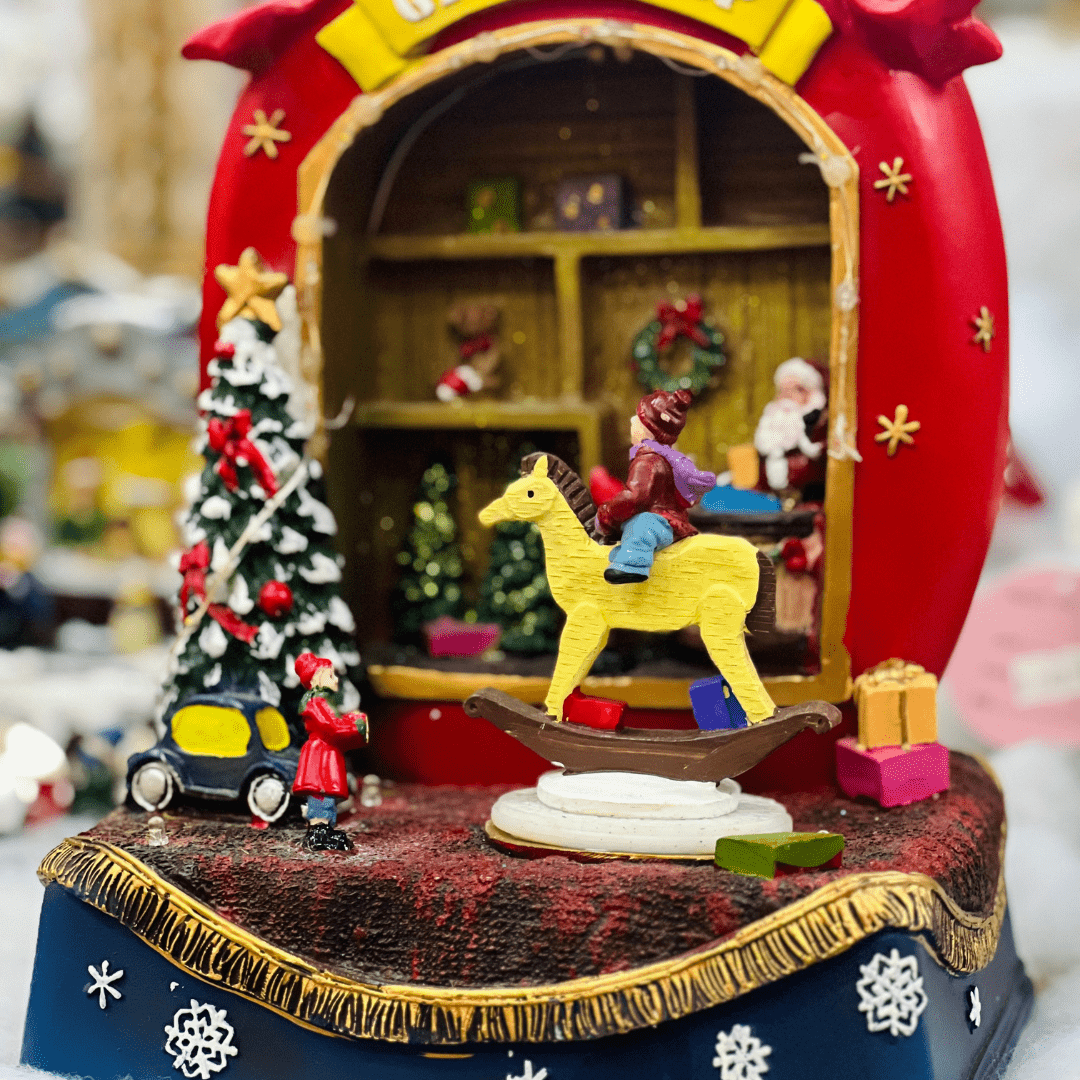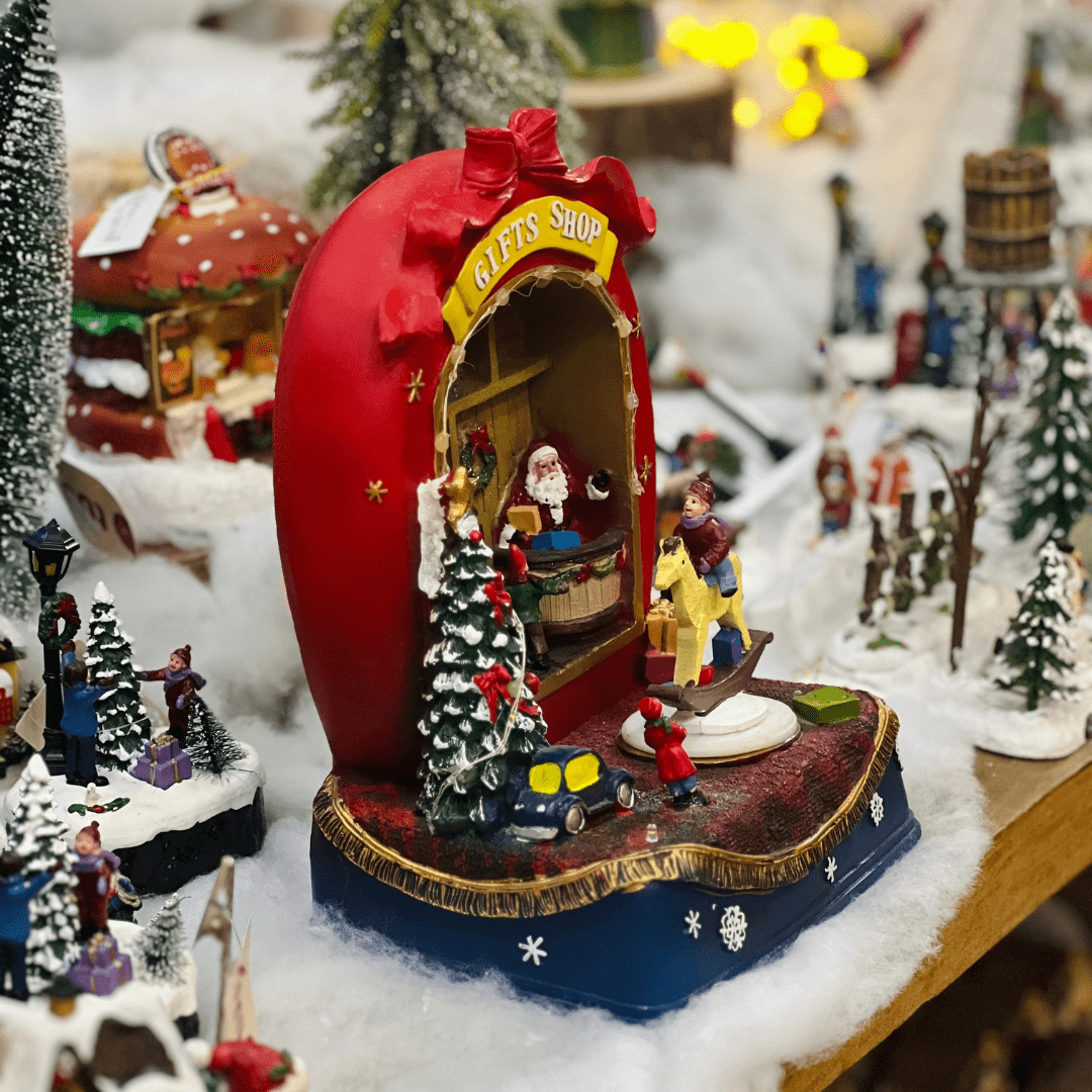 O Cenário Loja de Presentes é um encanto à parte para a decoração natalina. Produzido em resina, apresenta uma charmosa loja com detalhes delicados e iluminação em LED que cria um clima acolhedor e festivo. O movimento dá vida à cena, tornando o ambiente ainda mais mágico e cheio de encanto. Perfeito para compor vilarejos natalinos ou decorar aparadores e mesas.