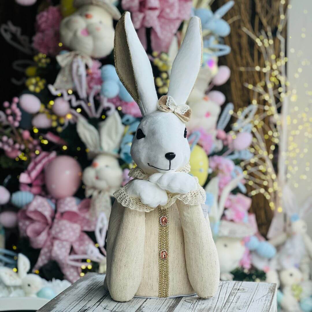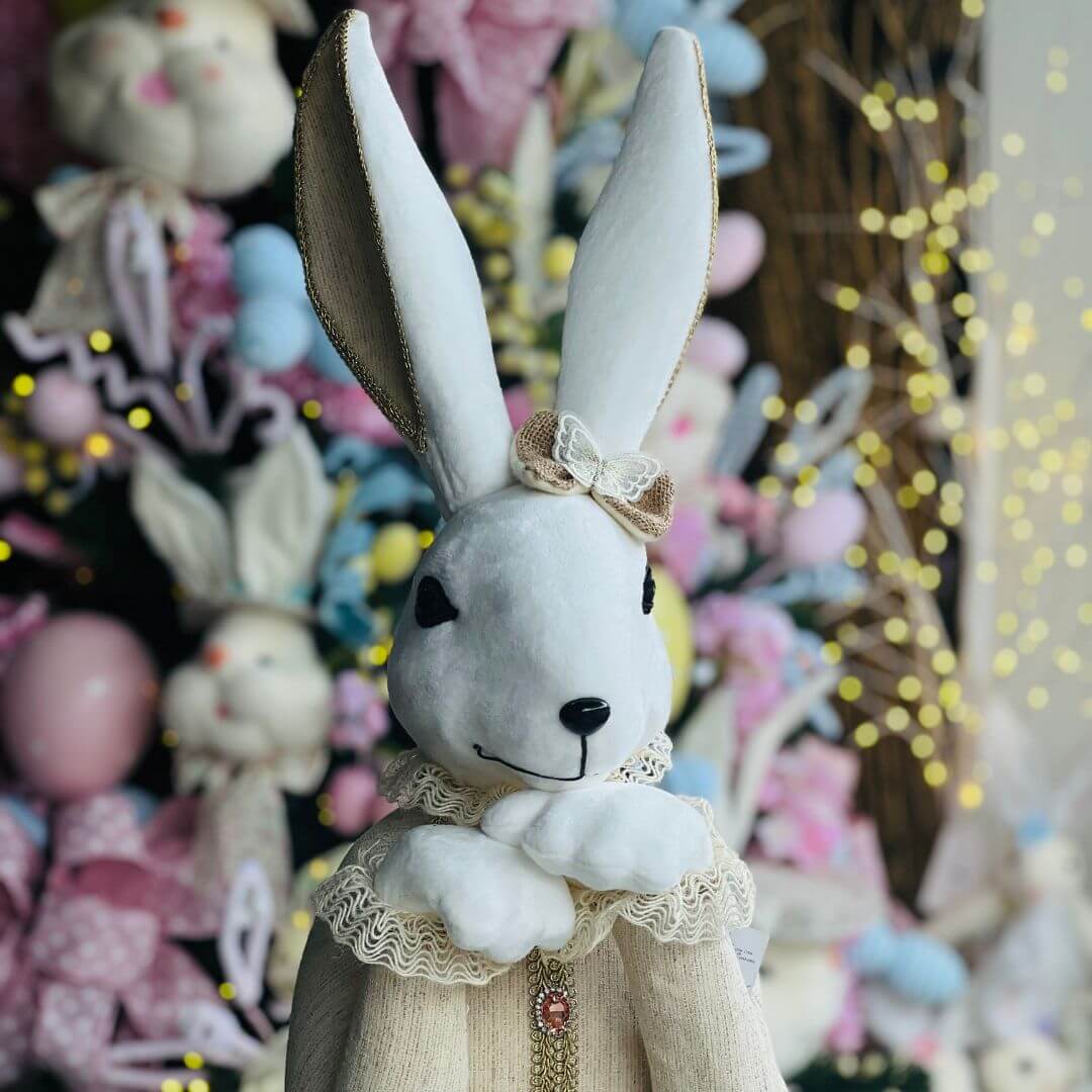 A Coelha de Tecido é uma peça encantadora e cheia de delicadeza, perfeita para compor decorações temáticas ou presentear com carinho. Confeccionada em tecido de alta qualidade, possui acabamento cuidadoso e detalhes que valorizam a peça, trazendo um visual acolhedor e elegante. Ideal para quartos, salas, vitrines ou composições de Páscoa, adiciona charme e personalidade ao ambiente. Com 62cm, é uma peça grande e marcante que se destaca na decoração.