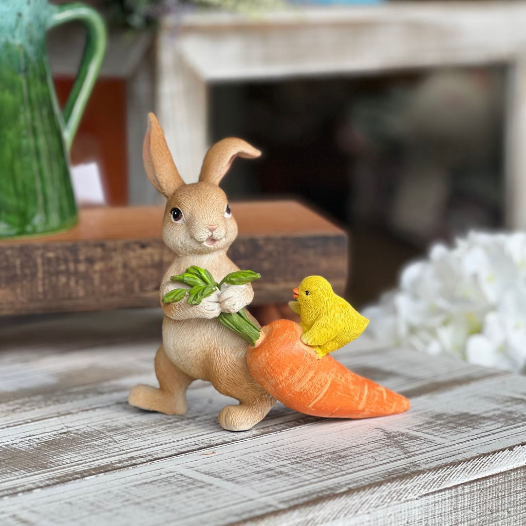 O Coelho com Cenoura e Pintinho é uma peça decorativa delicada e cheia de encanto, perfeita para compor ambientes com um toque temático e acolhedor. Produzido em resina de alta qualidade, possui acabamento detalhado e pintura cuidadosamente aplicada, destacando o coelho com a cenoura e o pintinho, formando uma composição harmoniosa e charmosa. Ideal para mesas, aparadores, prateleiras ou decorações de Páscoa. Com 15cm de altura, é compacto e se destaca na medida certa na decoração.