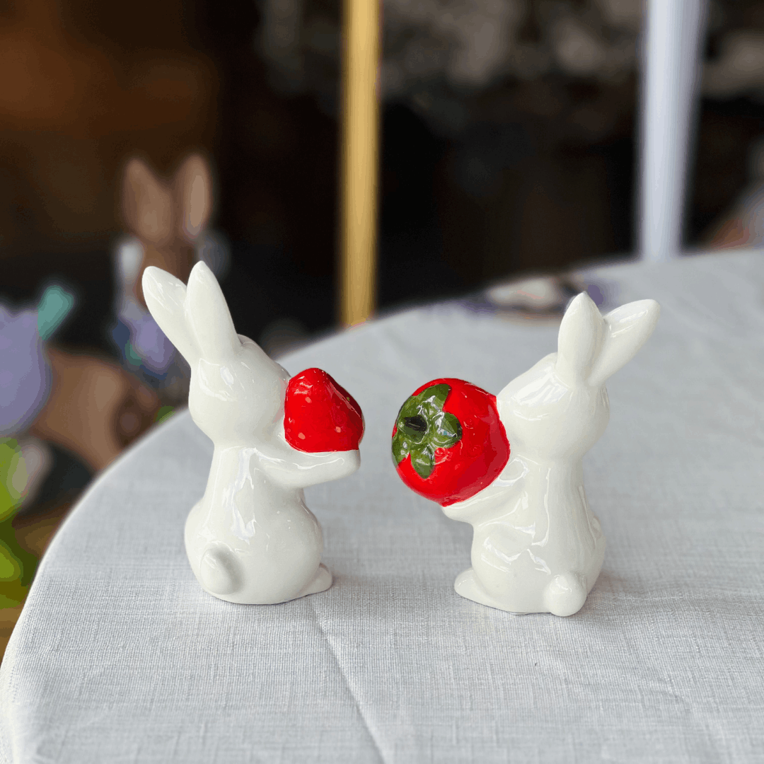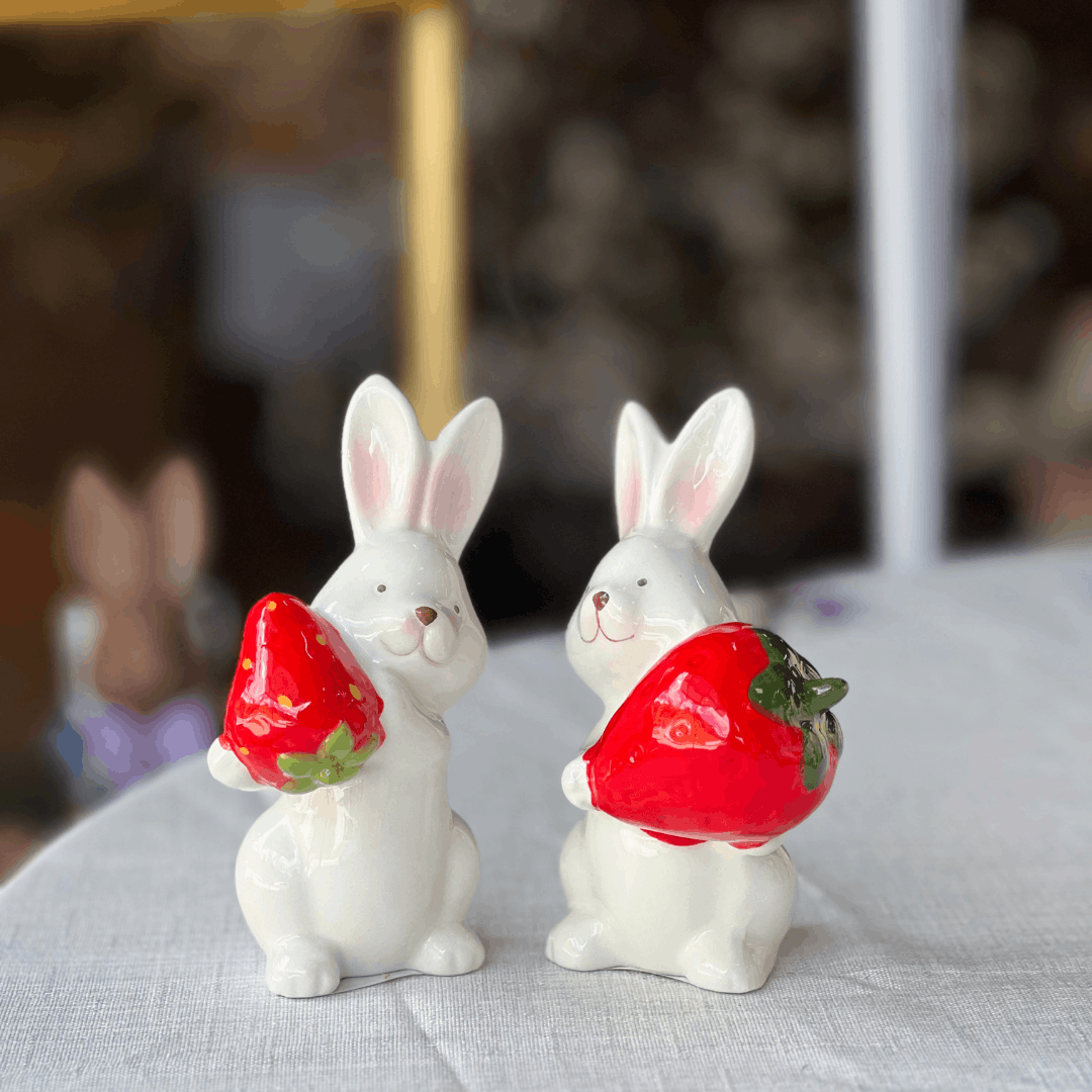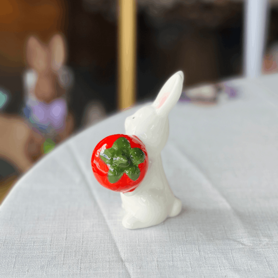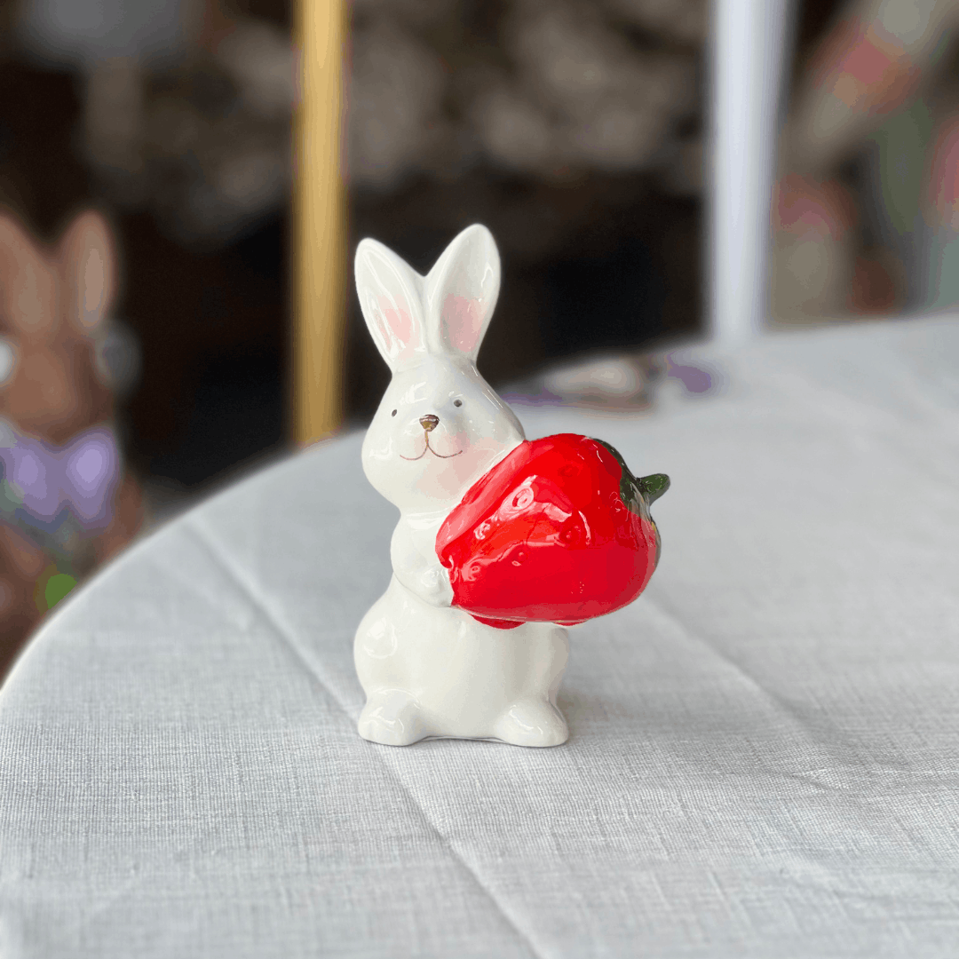 Coelho Com Morango de Cerâmica 12x8,5cm