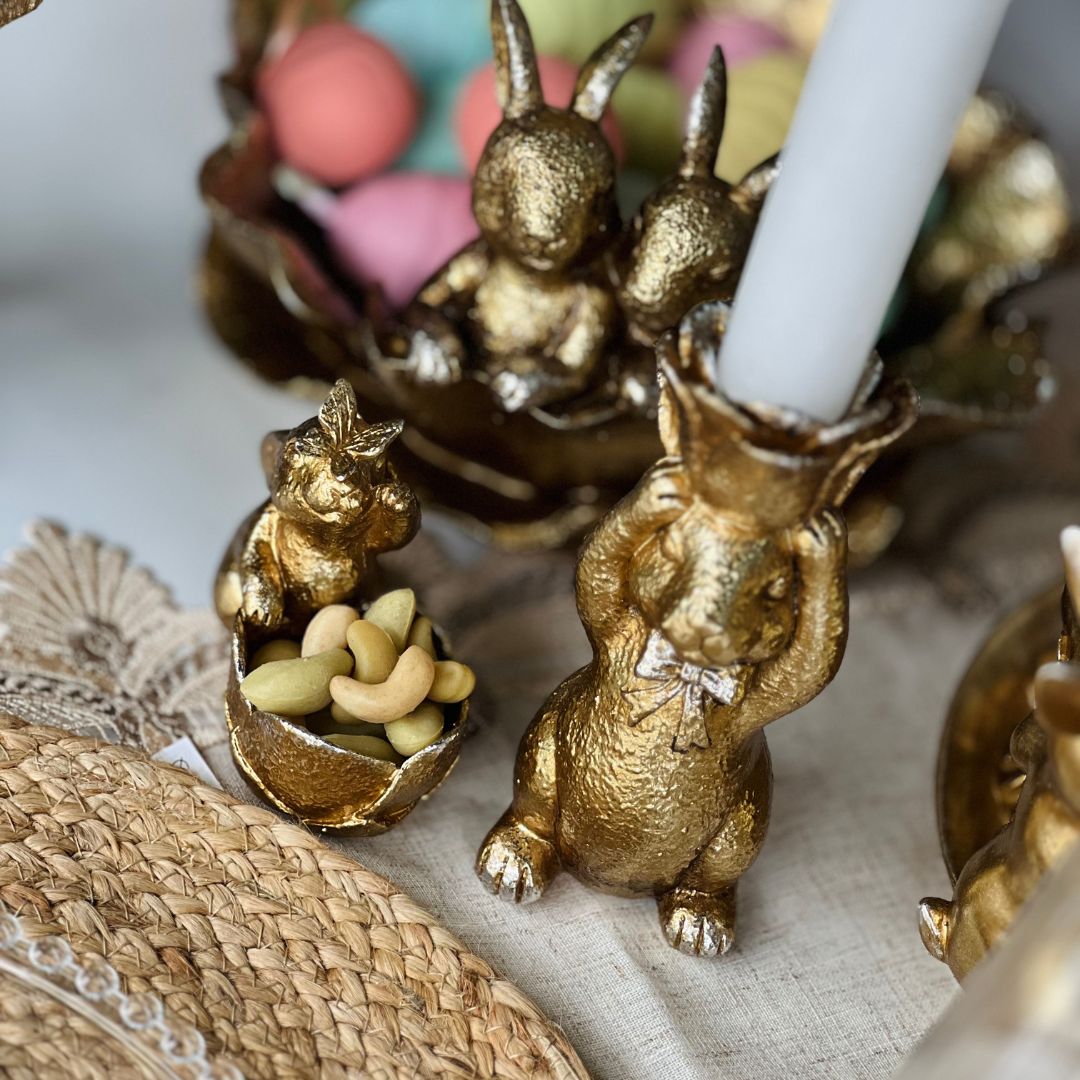 O Coelho com Cesto Dourado é uma peça decorativa delicada e elegante, ideal para trazer um toque sofisticado e encantador à decoração. Produzido em resina de alta qualidade, possui acabamento totalmente dourado, com detalhes cuidadosamente trabalhados que valorizam o design da peça. Seu visual refinado é perfeito para compor mesas, aparadores, prateleiras, centros de mesa ou decorações especiais. Com 9cm de altura, é compacto, versátil e adiciona charme e brilho na medida certa ao ambiente.