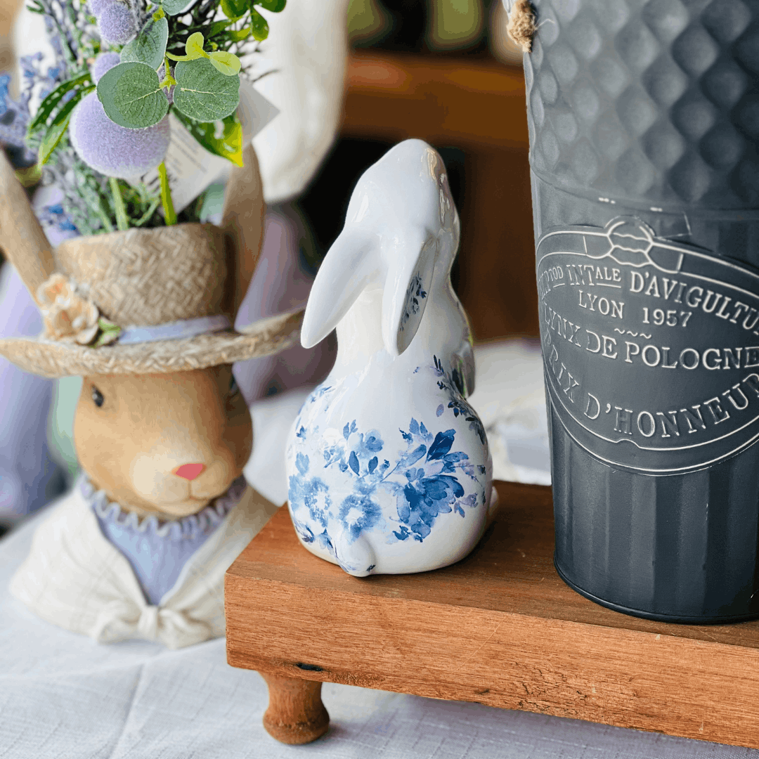 O Coelho Florido Branco e Azul de Cerâmica é uma peça delicada e sofisticada, ideal para compor decorações de Páscoa com elegância. Com acabamento em cerâmica e detalhes florais em tons de azul sobre base branca, traz charme e suavidade para mesas, aparadores, nichos e composições temáticas. Seu design refinado valoriza a decoração, tornando o ambiente mais acolhedor e harmonioso.