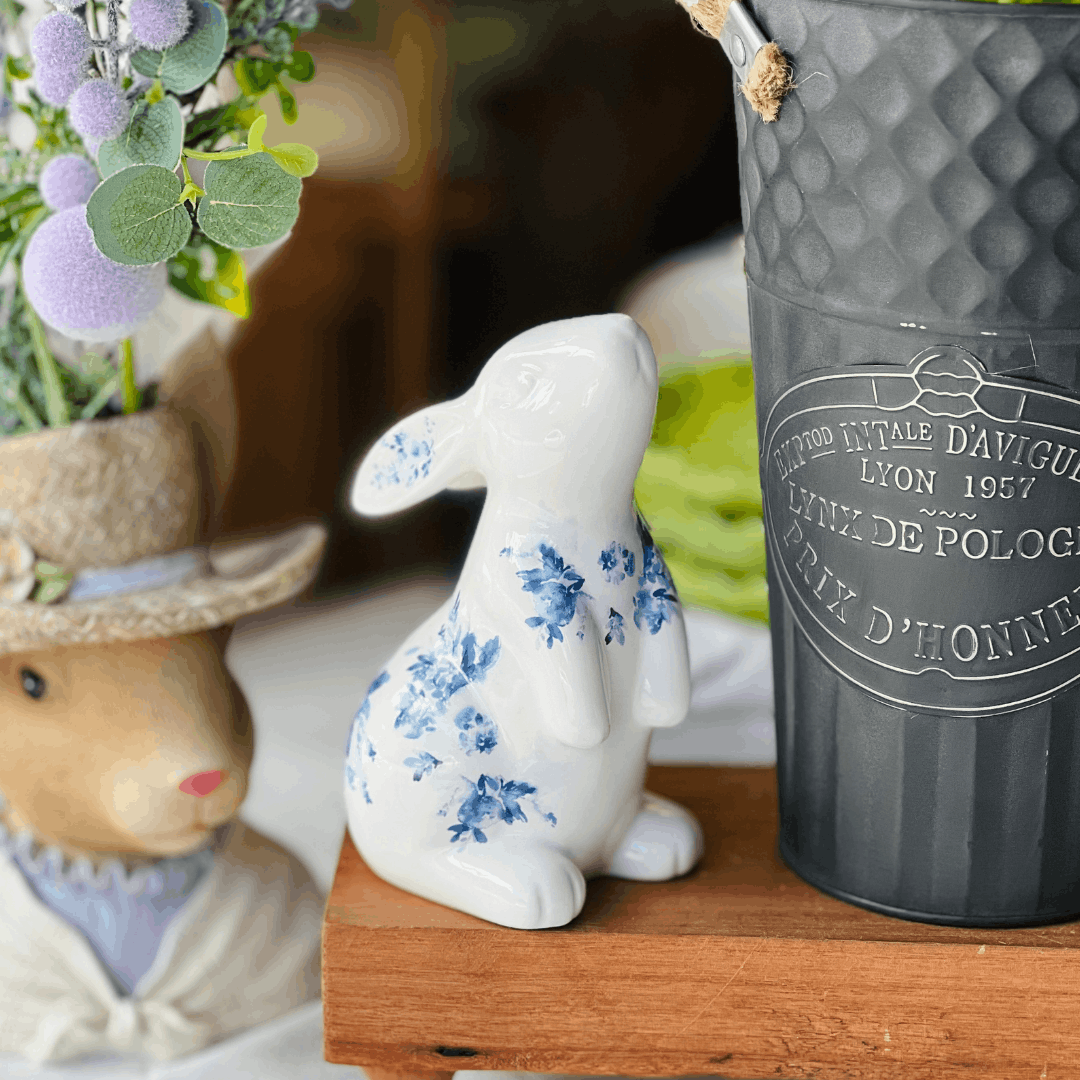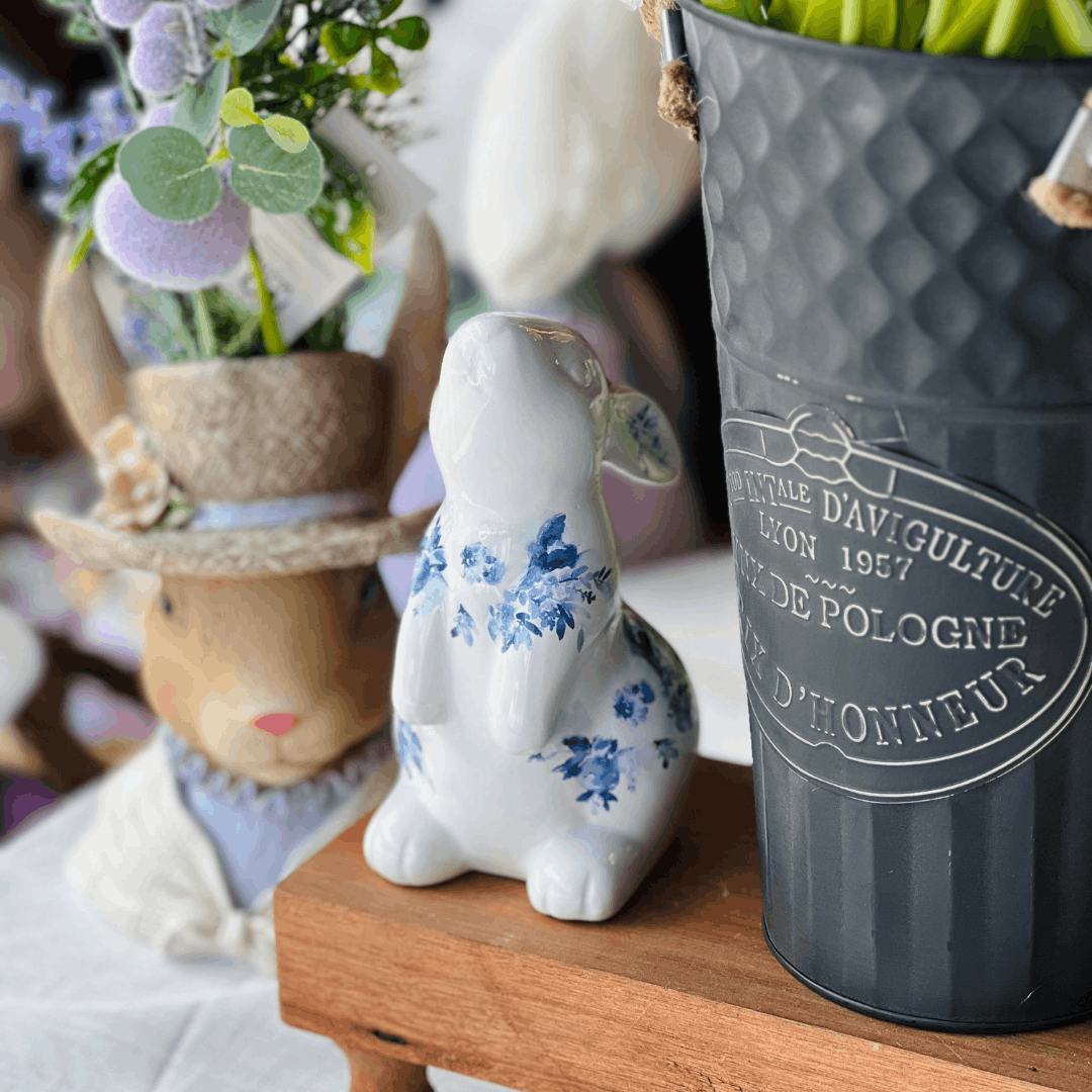 Coelho Florido Branco e Azul de Cerâmica 15cm
