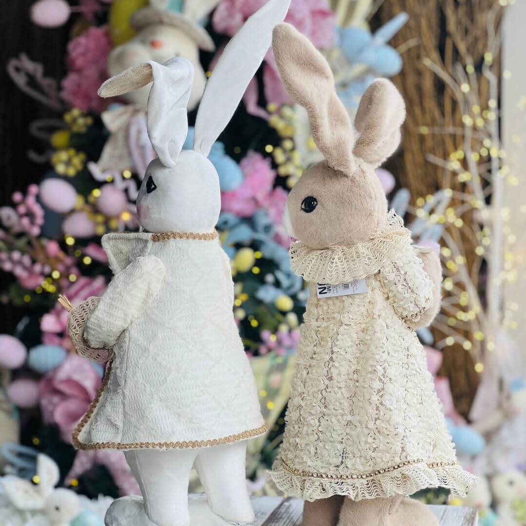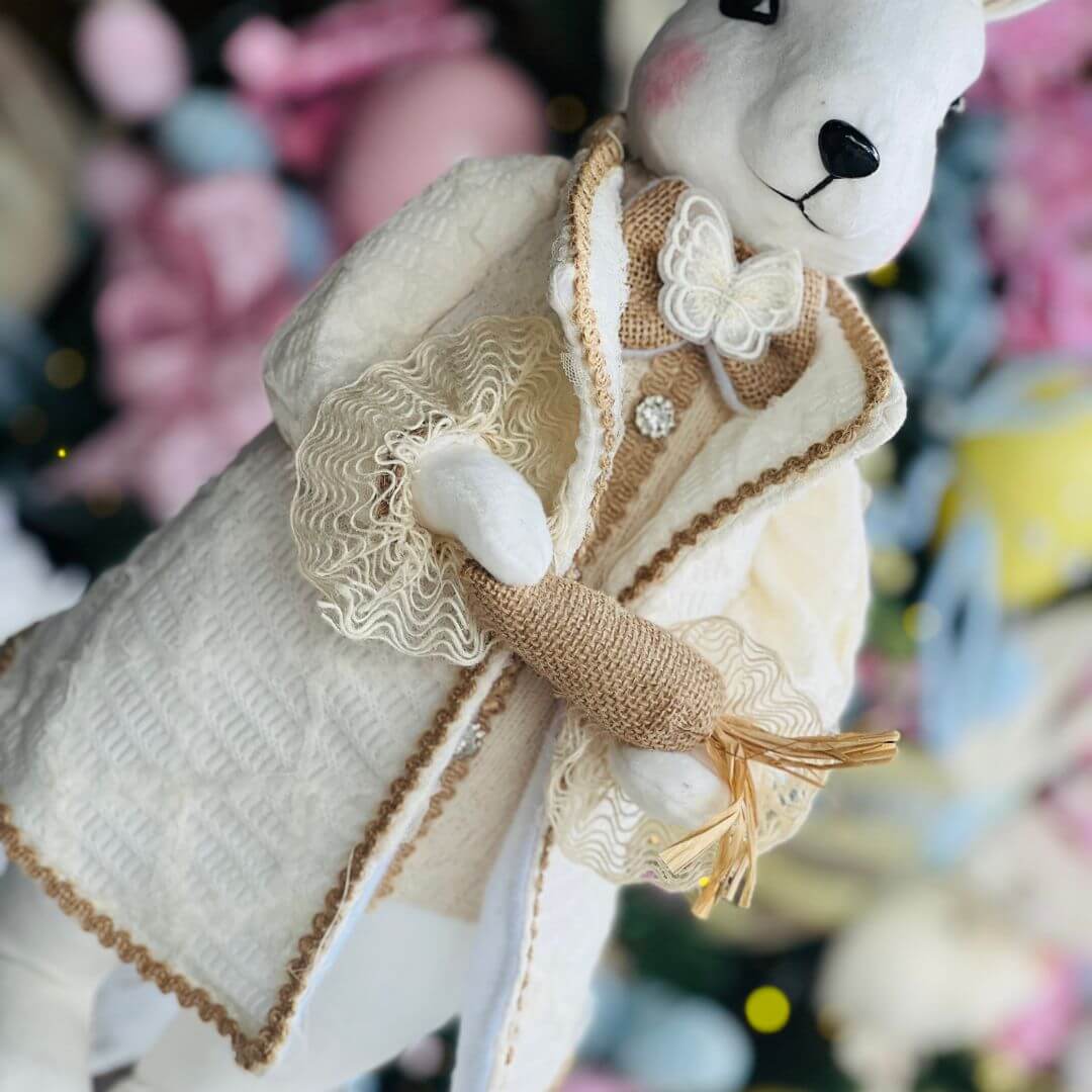 o Coelho de Tecido com Cenoura é uma peça delicada e encantadora, perfeita para compor ambientes com um toque temático e acolhedor. Confeccionada em tecido de alta qualidade, possui acabamento cuidadoso e detalhes que valorizam a peça, incluindo a cenoura que adiciona charme e personalidade à composição. Ideal para quartos, salas, vitrines ou decorações de Páscoa, traz leveza e elegância ao ambiente. Com 47cm, é uma peça marcante que se destaca na decoração.