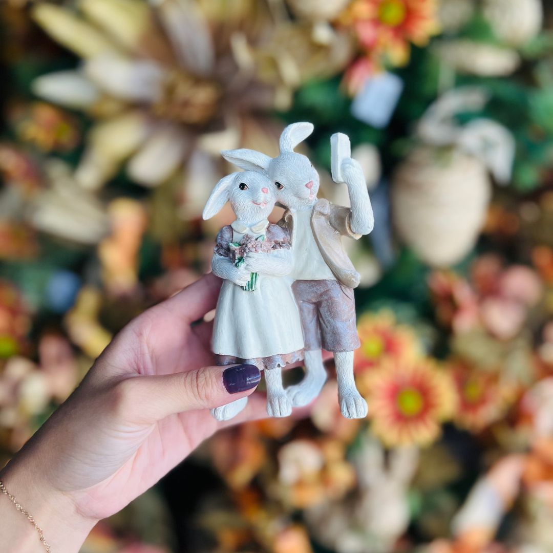Os Coelhos Tirando Selfie são uma peça decorativa divertida e cheia de personalidade, perfeita para trazer leveza e um toque moderno à decoração temática. Produzidos em resina, possuem acabamento detalhado e pintura cuidadosa, retratando os coelhos em um momento descontraído e encantador. Ideal para decorar mesas, aparadores, prateleiras ou composições especiais, adicionando charme, alegria e originalidade ao ambiente.