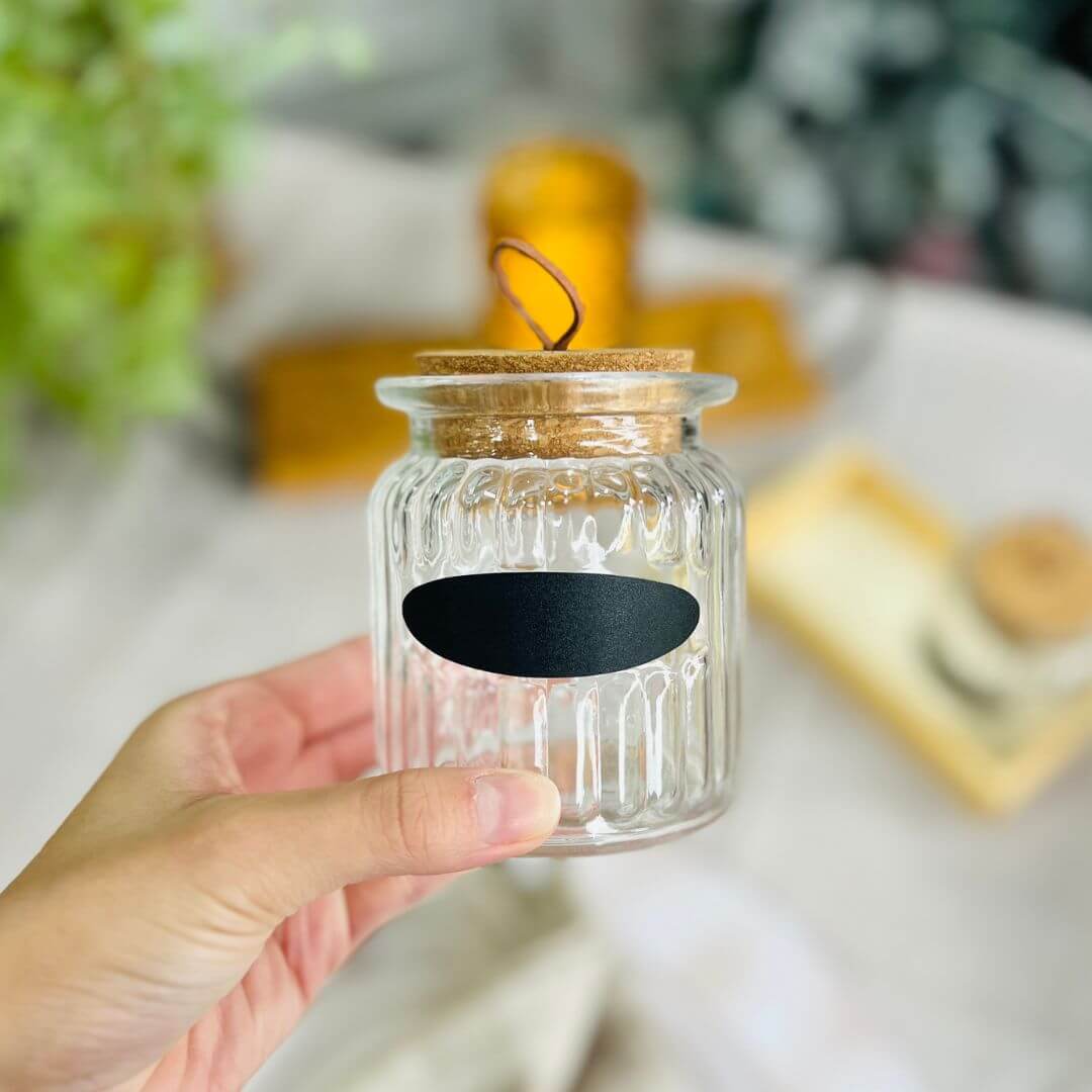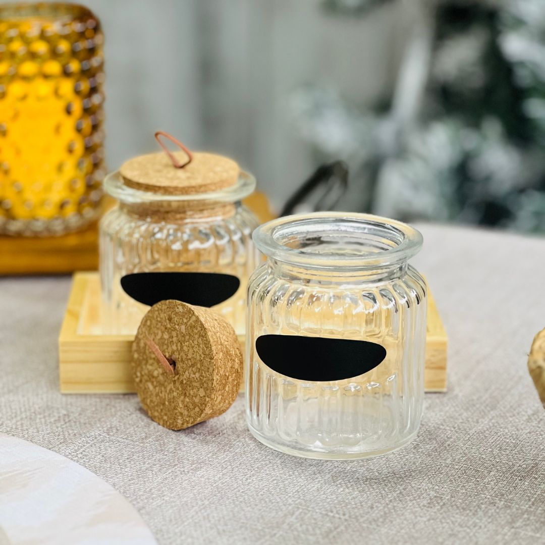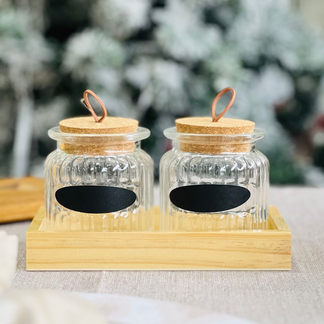 Conjunto de 2 Potes de Vidro Com Tampa de Rolha e Suporte de Madeira - 260ml