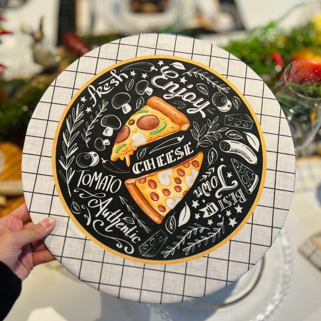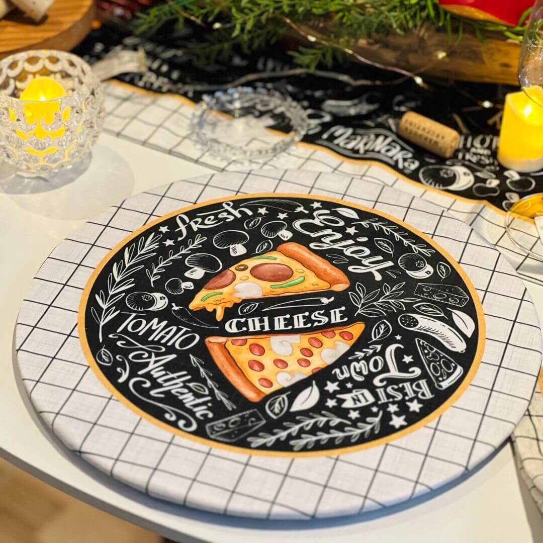 Conjunto para sousplat com estampa temática de pizza, ideal para deixar a mesa mais divertida e criativa. Perfeito para jantares italianos ou refeições em família, trazendo um toque temático e acolhedor à decoração da sua mesa posta.