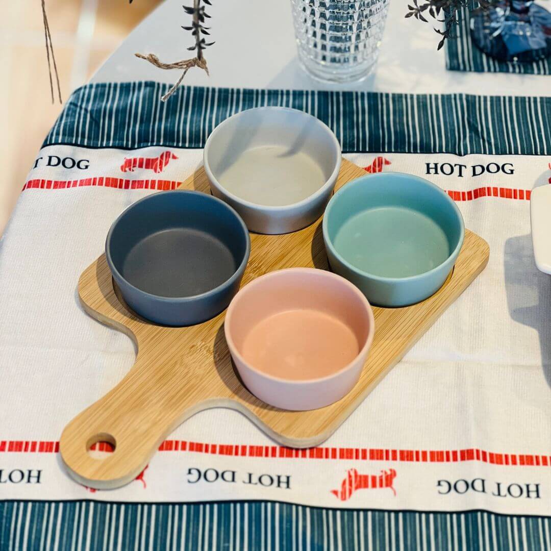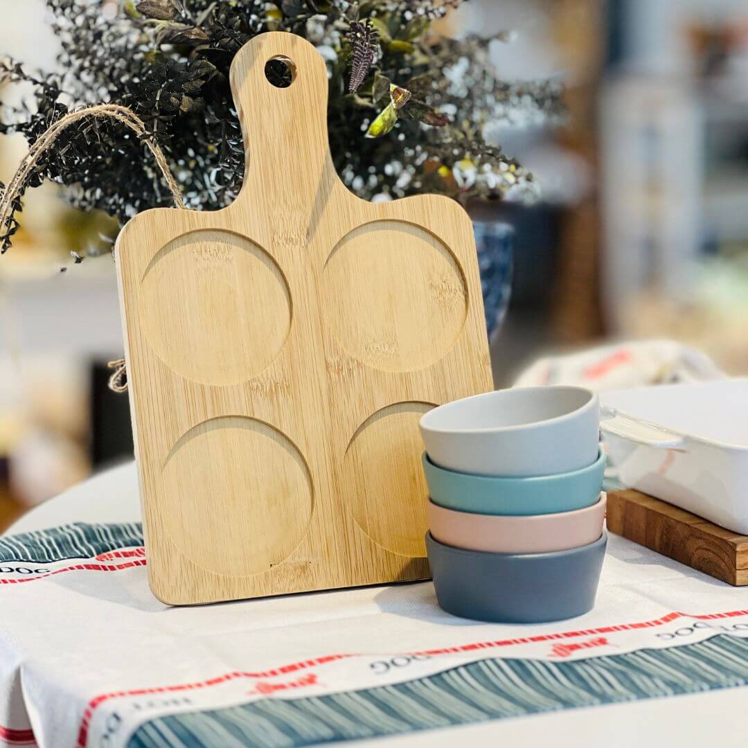 Conjunto Petisqueira com Bandeja de Bambu e Quatro Potes – 21 cm x 32 cm