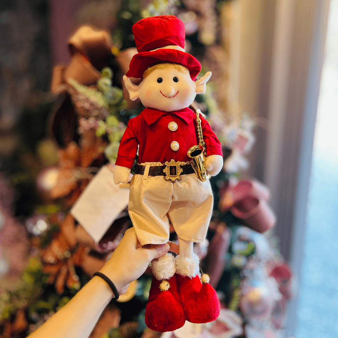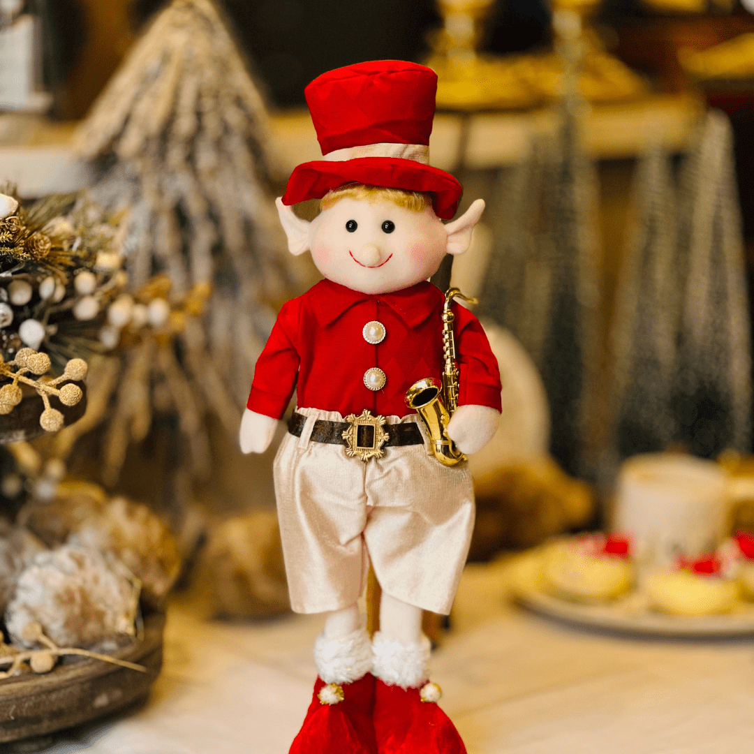 Encante sua decoração de Natal com este divertido elfo natalino segurando um saxofone. Produzido com detalhes delicados, ele combina as cores vermelho e dourado, transmitindo alegria, música e espírito festivo para qualquer ambiente da casa.