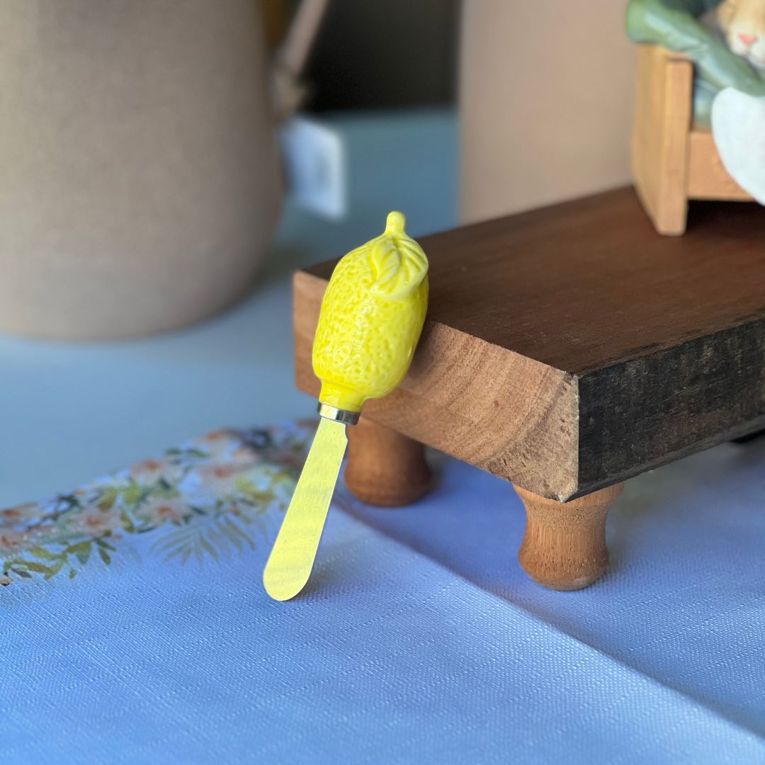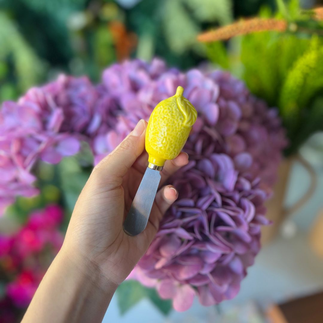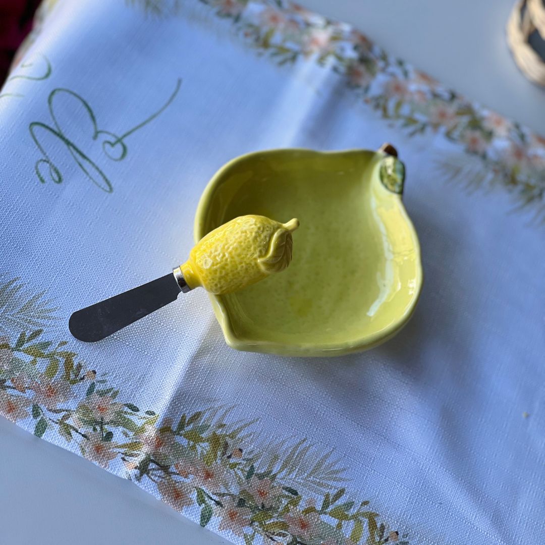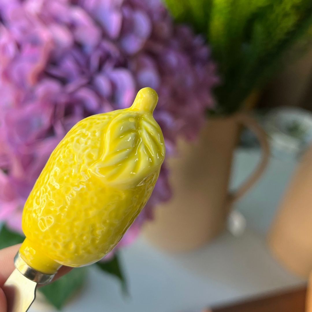 A Espátula para Manteiga é uma peça funcional e cheia de charme, perfeita para compor uma mesa posta elegante e criativa. Produzida em aço inoxidável, oferece resistência e durabilidade no uso diário. O cabo em formato de limão siciliano, feito em cerâmica, adiciona um toque sofisticado e descontraído à peça, tornando-a ideal para servir manteiga, patês, geleias e cremes com estilo. Com 12cm, é prática, delicada e perfeita para ocasiões especiais ou para deixar o dia a dia mais bonito.
