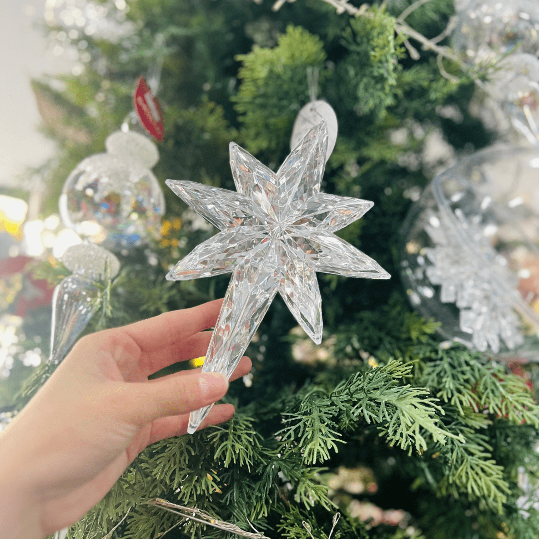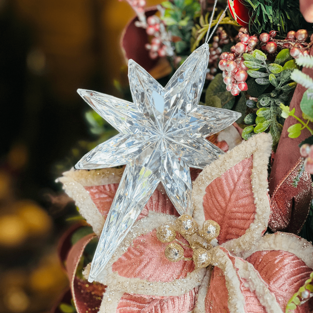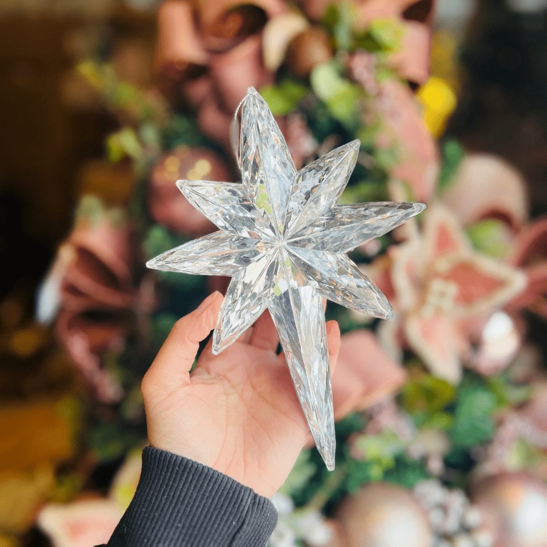 Deixe sua decoração ainda mais encantadora com esta estrela natalina em cristal de acrílico. Com design elegante e brilho translúcido, é perfeita para pendurar na árvore de Natal, em guirlandas, janelas ou arranjos decorativos, trazendo sofisticação e um toque especial às festas.