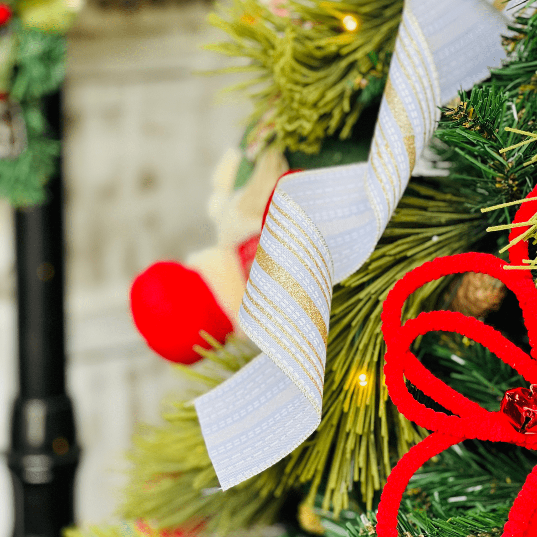 A Fita Aramada Branco e Dourado Com Glitter é perfeita para adicionar brilho e elegância à decoração natalina. Seu acabamento cintilante valoriza guirlandas, árvores, arranjos e embalagens de presente, enquanto a estrutura aramada facilita a modelagem de laços firmes e bem definidos. Uma peça versátil e sofisticada para composições festivas.