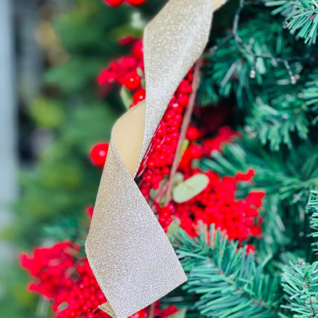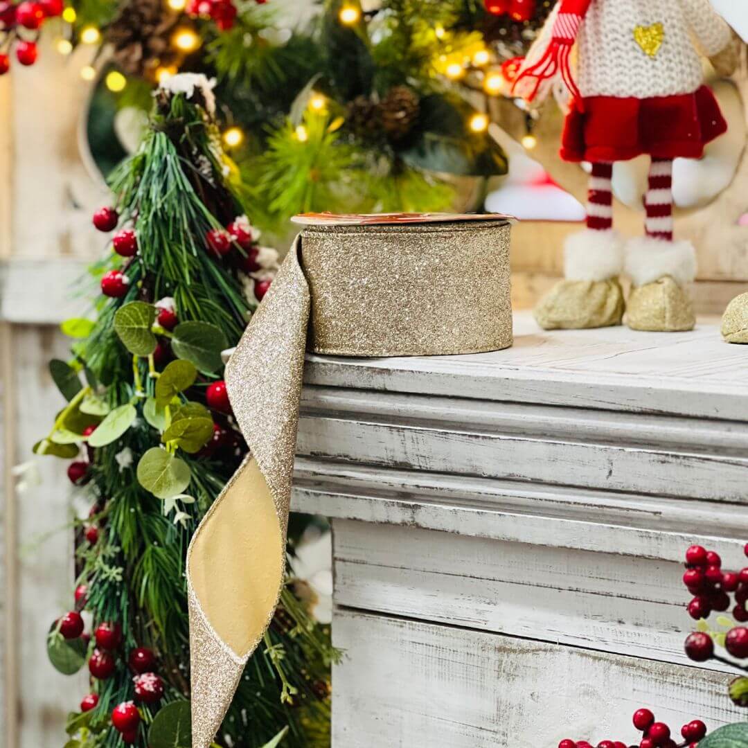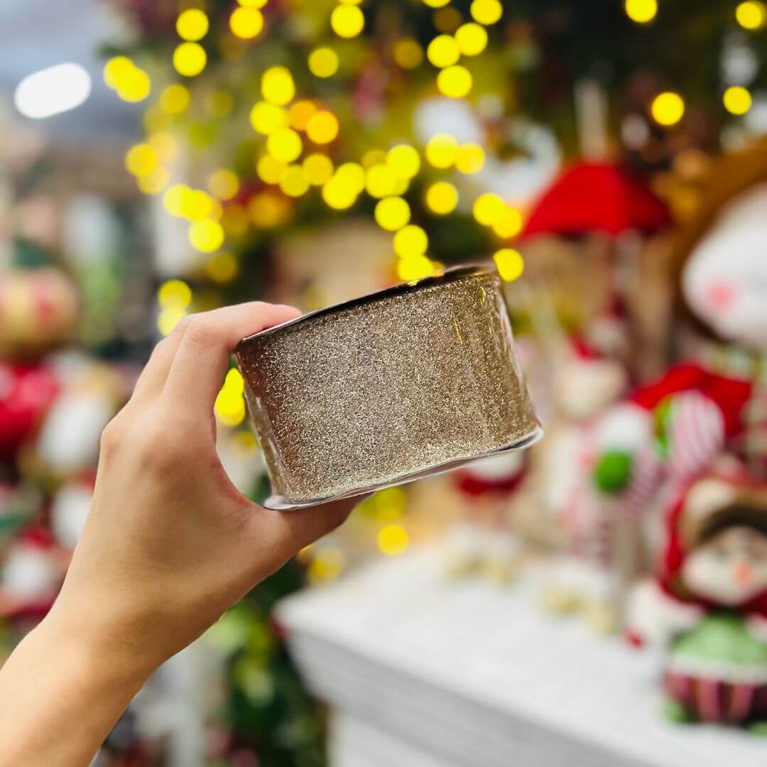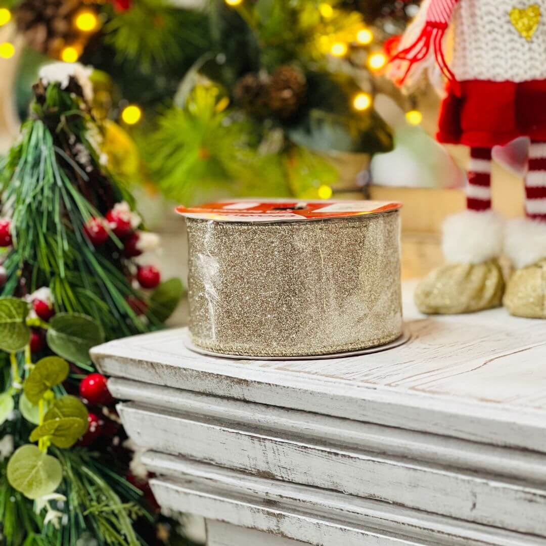 Descrição: Fita decorativa com acabamento em glitter dourado, perfeita para trazer brilho e sofisticação à sua decoração. Ideal para laços, guirlandas, embalagens, arranjos festivos e projetos artesanais. A borda aramada facilita a modelagem e mantém os laços bem estruturados.