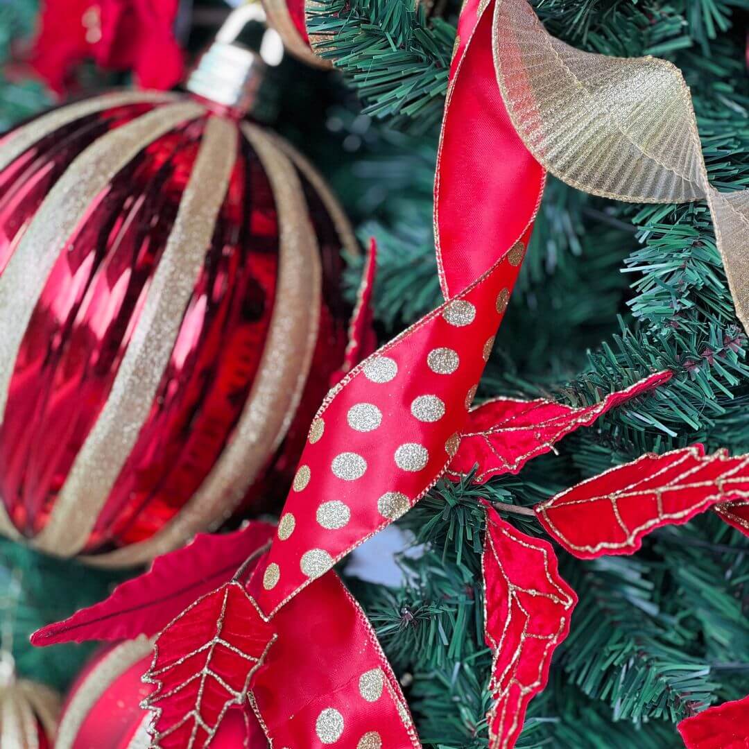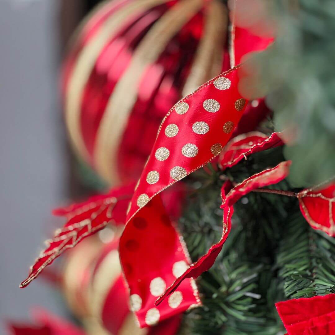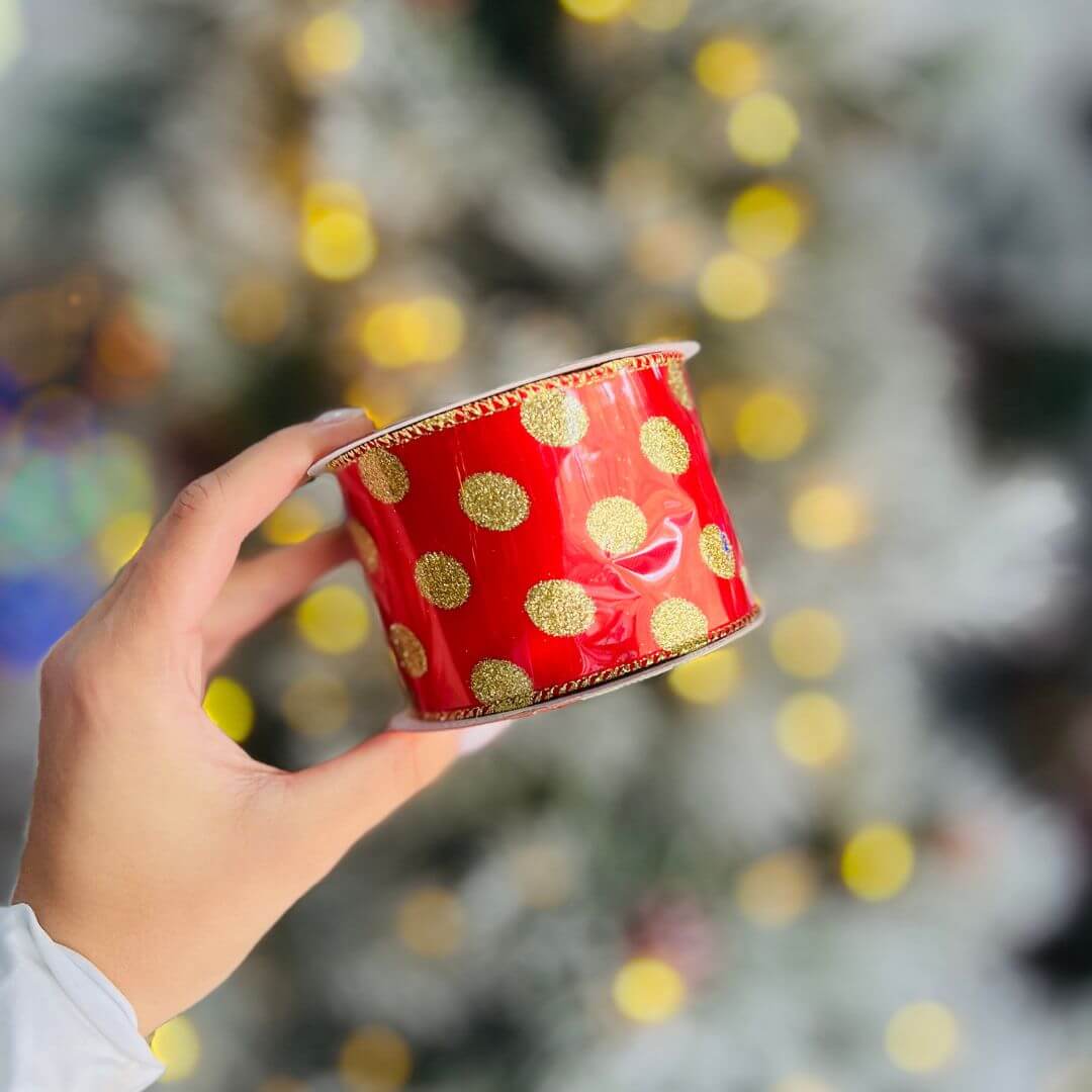 Elegante fita decorativa, combinando as cores vermelho e dourado, ideal para personalizar decorações de Natal, guirlandas, arranjos e presentes com um toque de requinte. A fita possui acabamento brilhante.