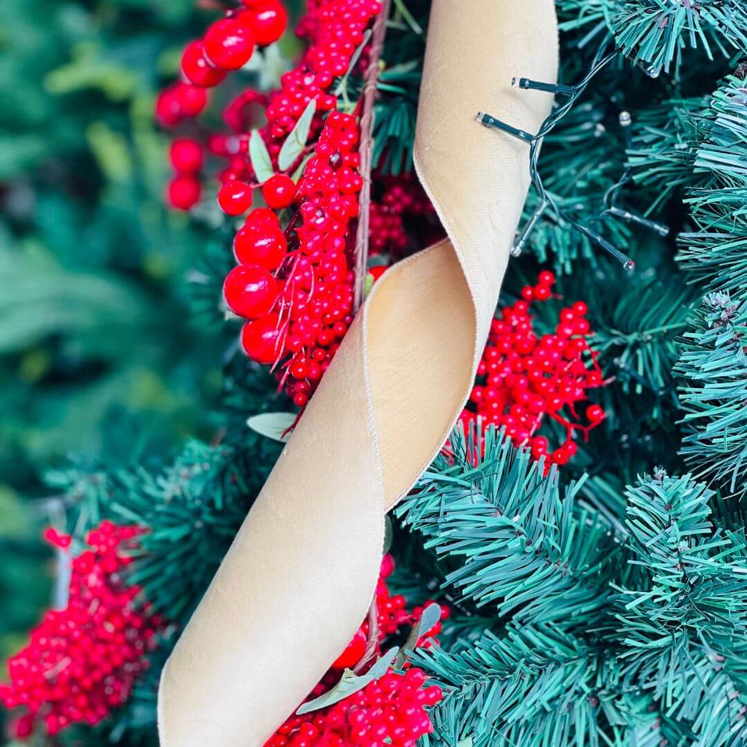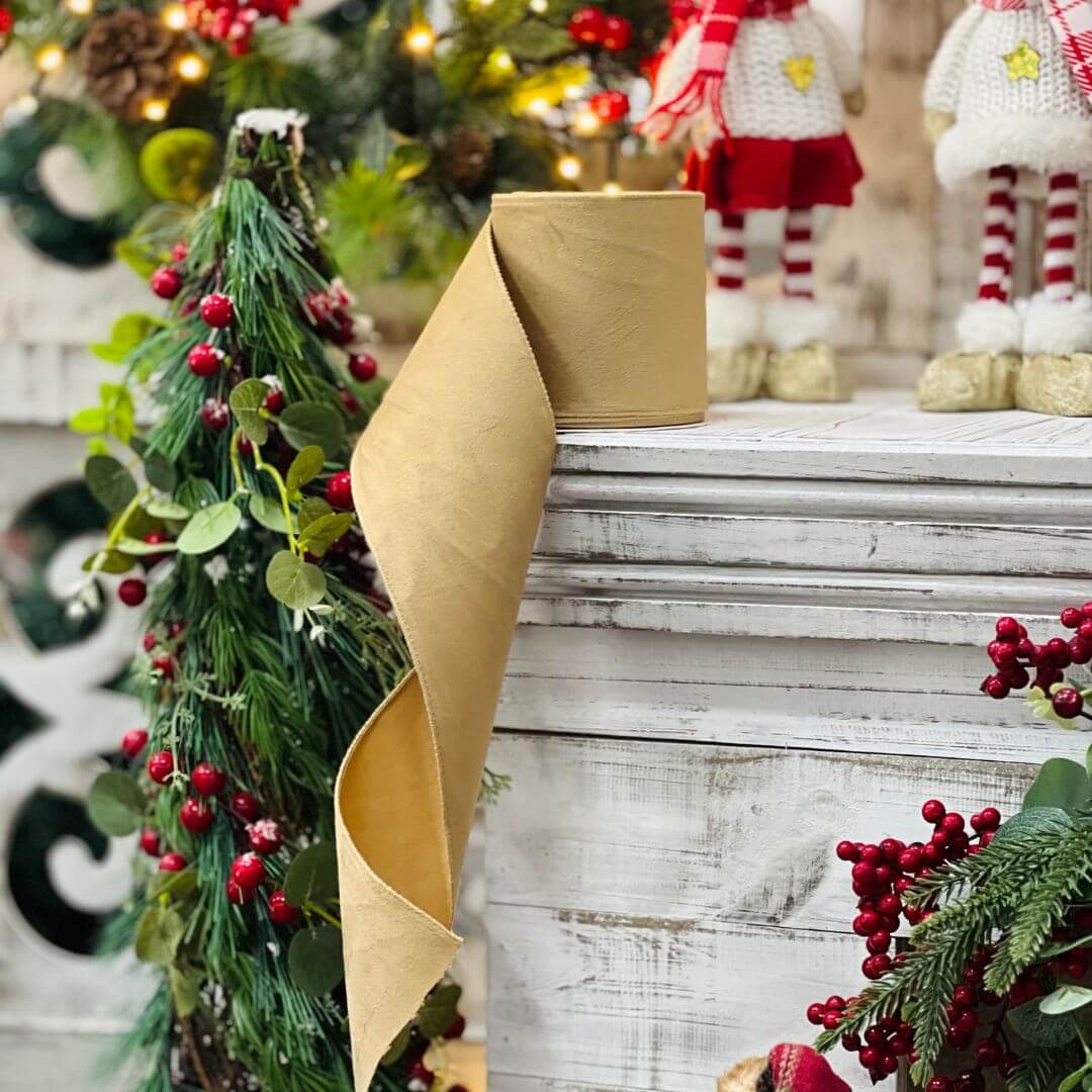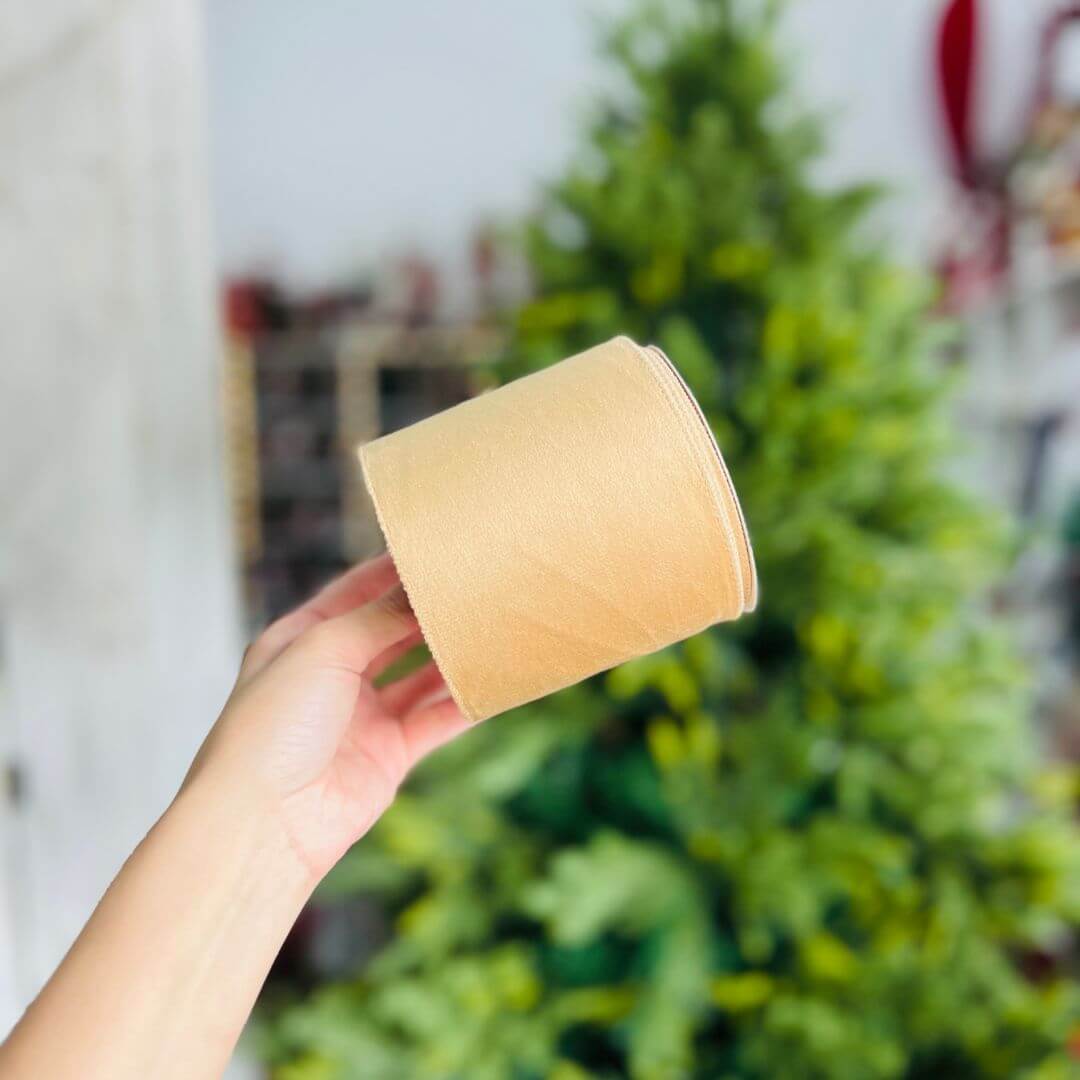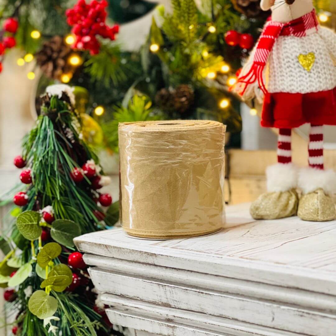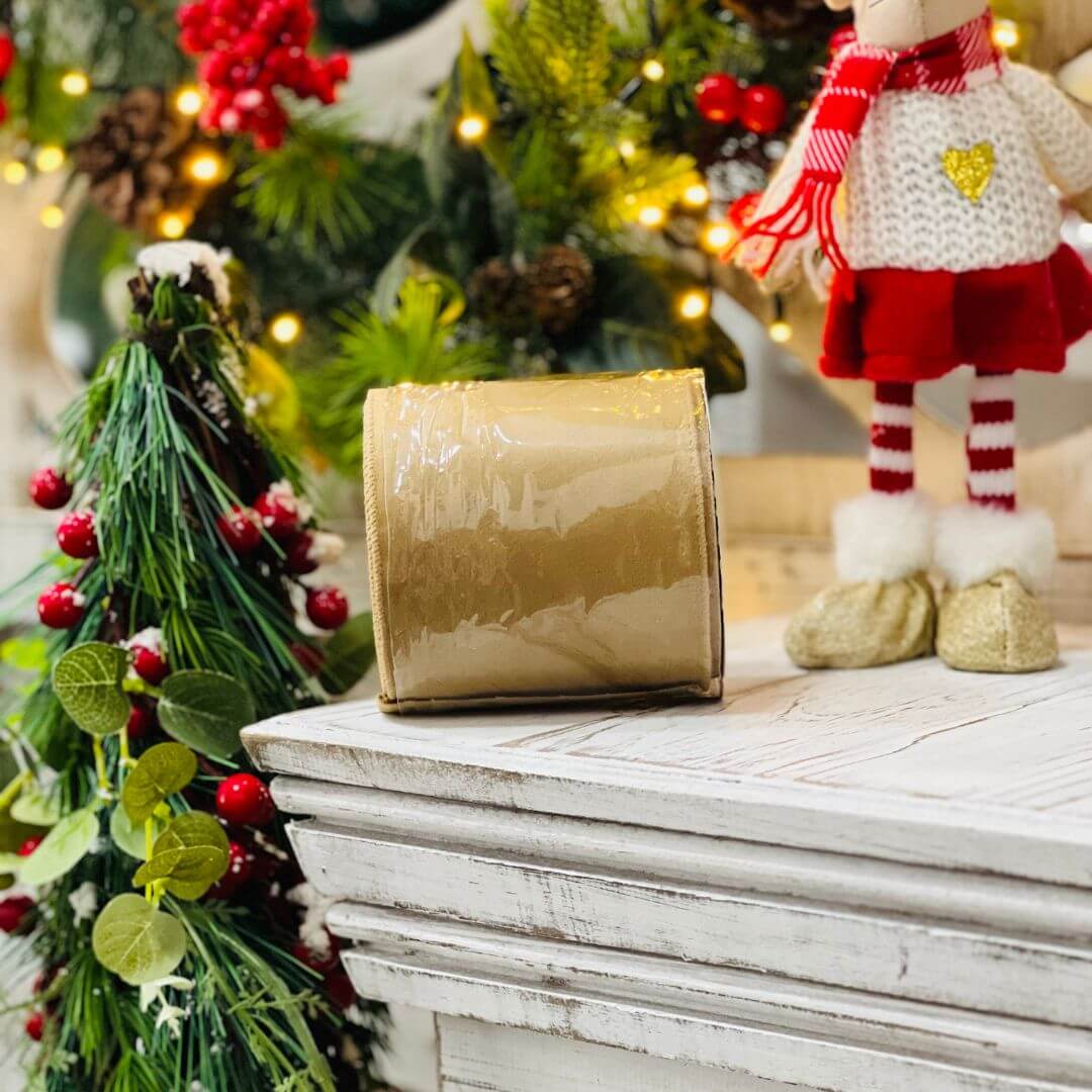 Fita decorativa dourada com borda aramada, perfeita para dar um toque elegante e sofisticado em laços, guirlandas, embalagens, arranjos florais e decorações festivas. Sua estrutura aramada proporciona facilidade na modelagem e firmeza no acabamento, ideal para composições refinadas.