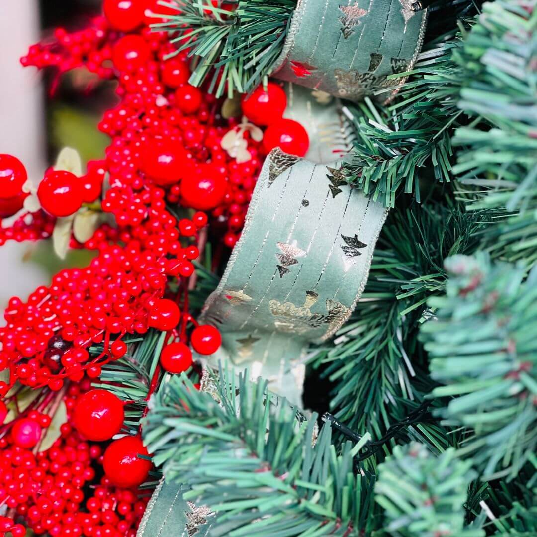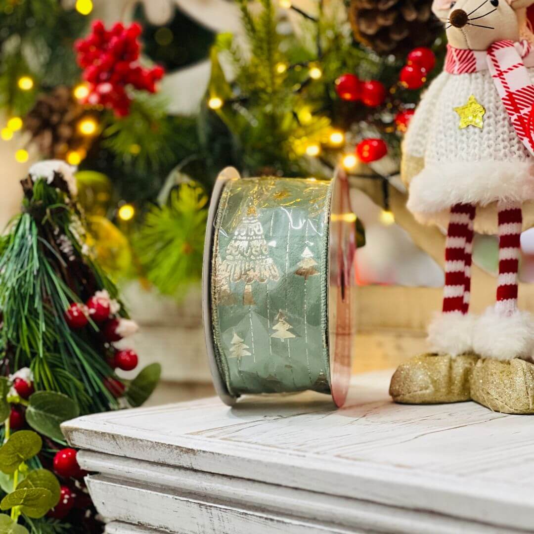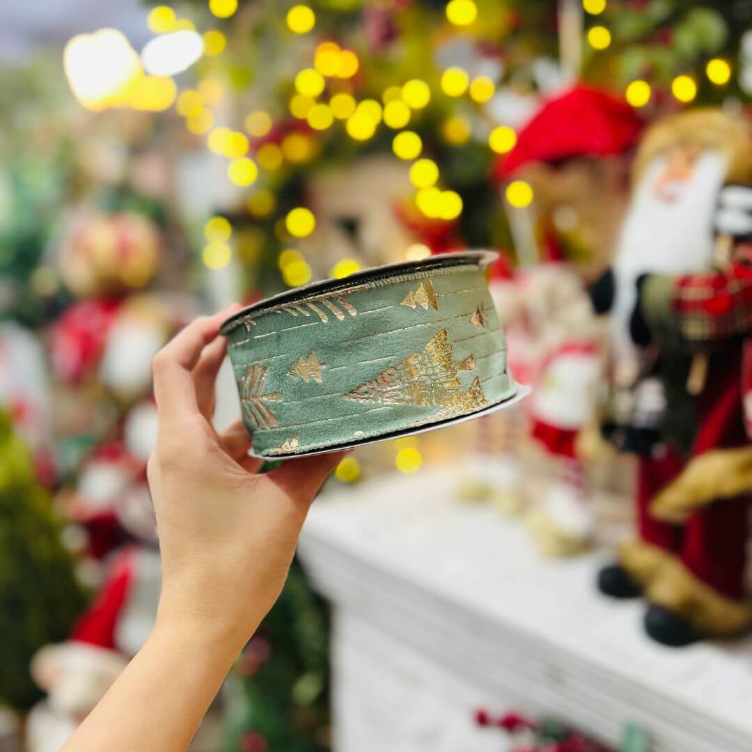 Fita decorativa em veludo verde com estampa de pinheiros, perfeita para composições natalinas sofisticadas e elegantes. A textura aveludada adiciona charme e requinte, enquanto a borda aramada permite criar laços bem estruturados para guirlandas, árvores, embalagens e arranjos temáticos.