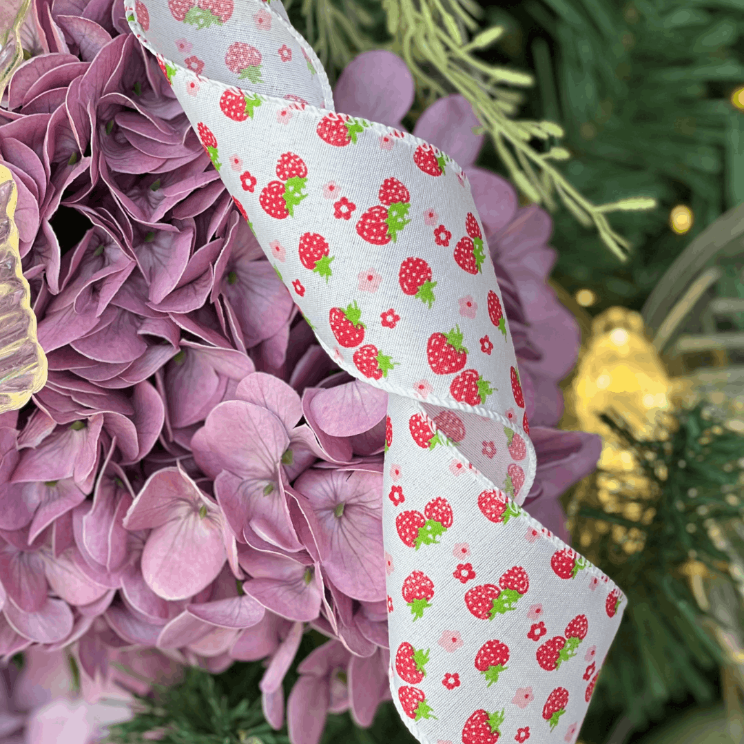 Fita Decorativa Aramada Morangos Branco e Vermelho 6,3cm x 9,14m