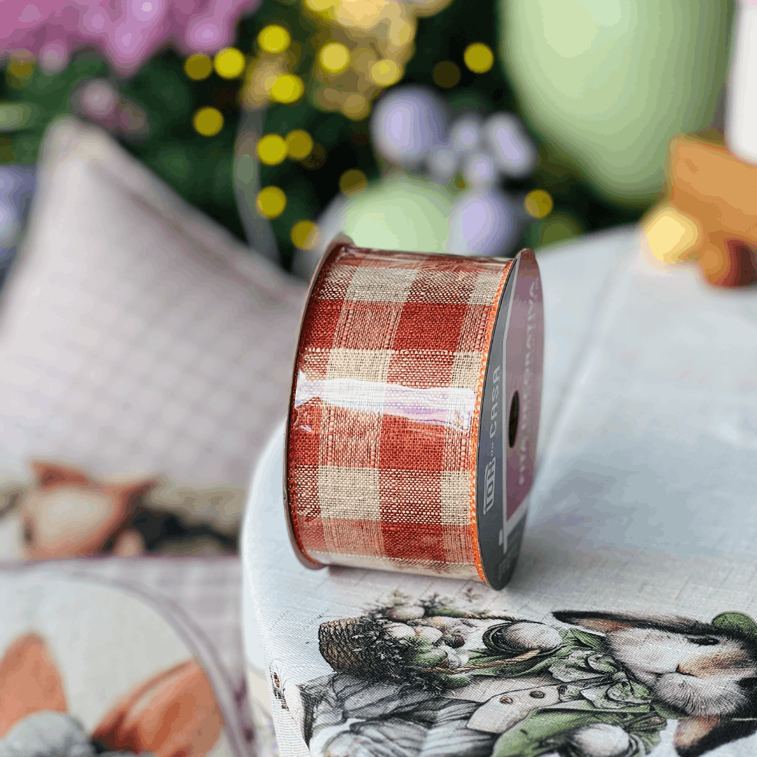 A Fita Decorativa Aramada Xadrez Laranja e Bege é ideal para compor arranjos, laços e decorações com um toque acolhedor e versátil. Com estampa xadrez em laranja e bege, adiciona charme e destaque às composições, sendo perfeita para guirlandas, embalagens, arranjos florais e projetos artesanais. Possui estrutura aramada nas laterais, que facilita a modelagem e proporciona melhor acabamento.
