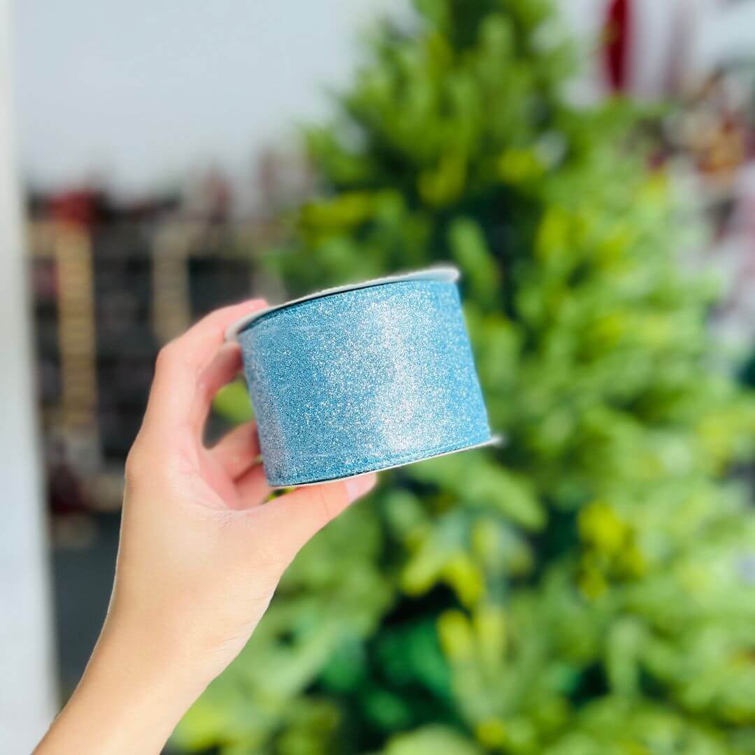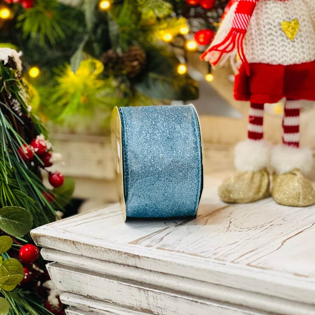 Fita decorativa com acabamento em glitter azul claro e borda aramada, ideal para criar laços estruturados e destacar embalagens, guirlandas, arranjos e outros itens artesanais ou decorativos. Um toque de brilho e elegância para composições especiais.