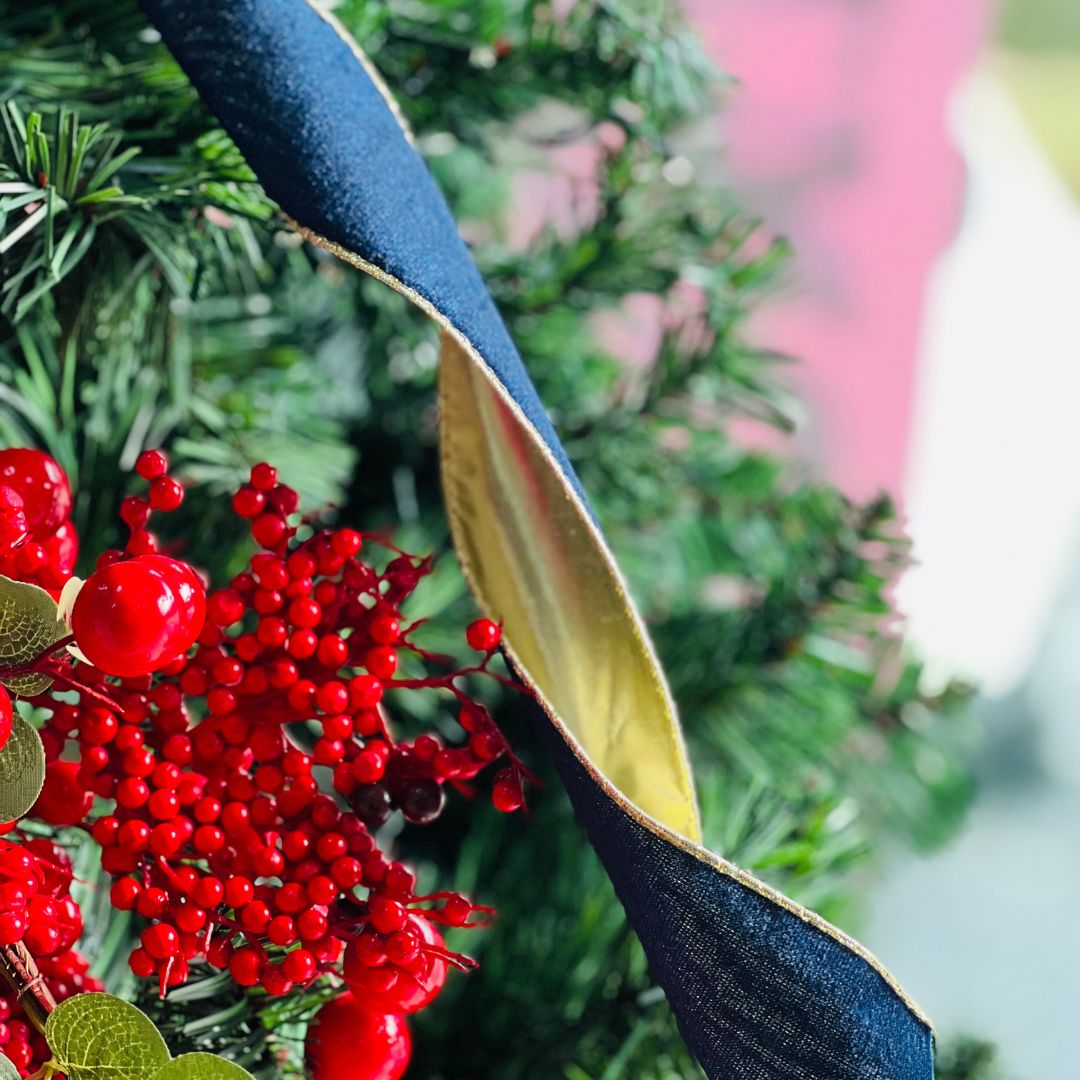 A Fita Natalina Azul é uma opção elegante e versátil para compor sua decoração de Natal. Ideal para laços, embrulhos, guirlandas e árvores natalinas, ela oferece um acabamento refinado com suas bordas aramadas, que facilitam a modelagem e garantem maior firmeza na aplicação.
