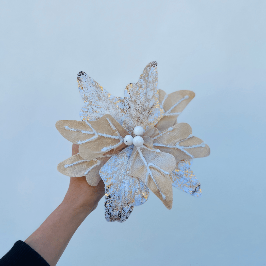 A Flor Natalina Poinsetia Champanhe 20x20cm é um enfeite clássico e sofisticado que traz brilho e elegância à decoração natalina. Seu tom champanhe confere um visual refinado e harmonioso, ideal para compor guirlandas, arranjos, árvores de Natal ou centros de mesa, adicionando um toque festivo e encantador.