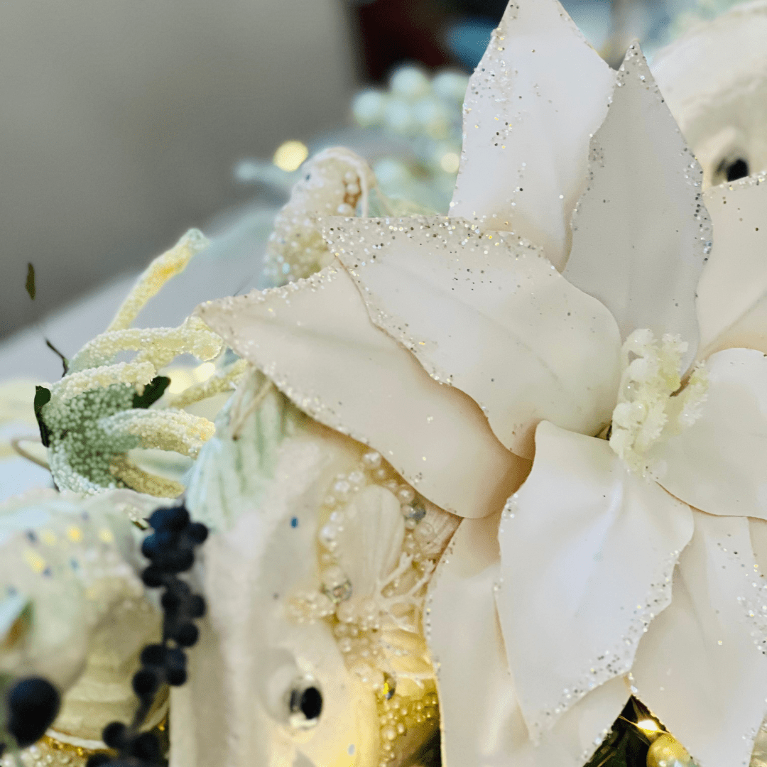 A Flor Natalina Poinsetia Com Glitter Branca é um lindo adorno para realçar a beleza da sua decoração de Natal. Seu acabamento com glitter confere um brilho delicado e elegante, ideal para compor guirlandas, arranjos, árvores natalinas ou centros de mesa. A cor branca traz leveza e sofisticação, tornando o ambiente mais encantador e festivo.