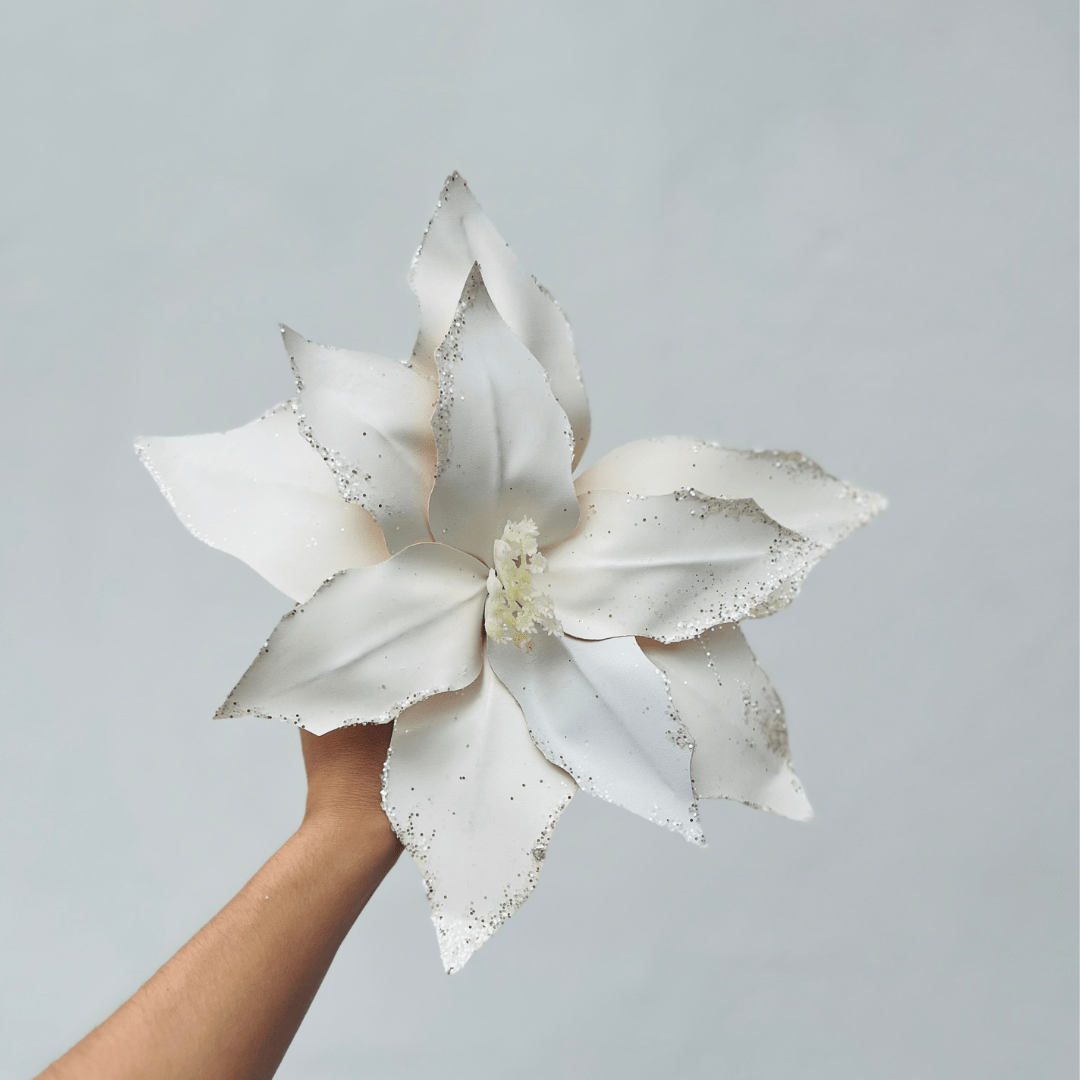 Flor Natalina Poinsetia Com Glitter Branca 35x30cm