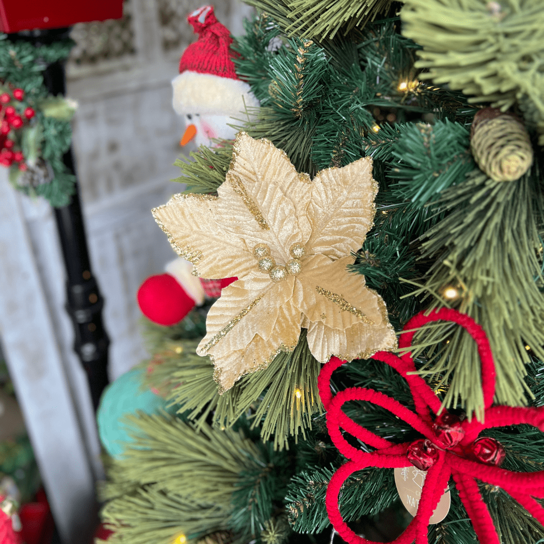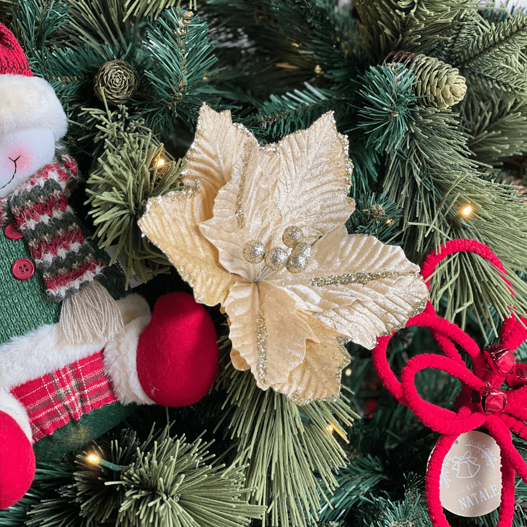 A Flor Natalina Poinsetia Dourada 25cm é perfeita para quem busca um toque de brilho e elegância na decoração de Natal. Seu acabamento dourado realça o visual festivo, enquanto as pétalas detalhadas proporcionam um efeito sofisticado em árvores, guirlandas, arranjos e enfeites diversos.