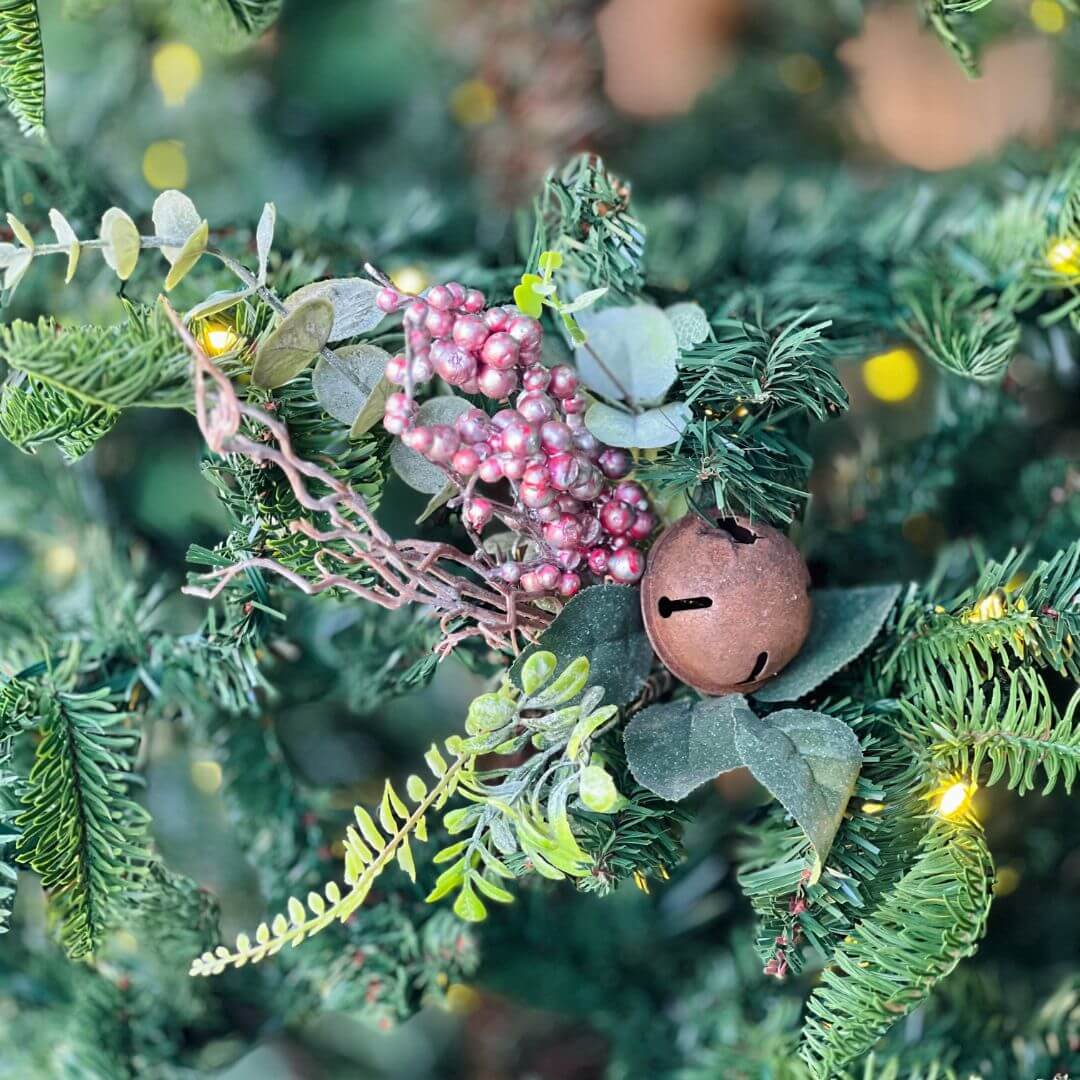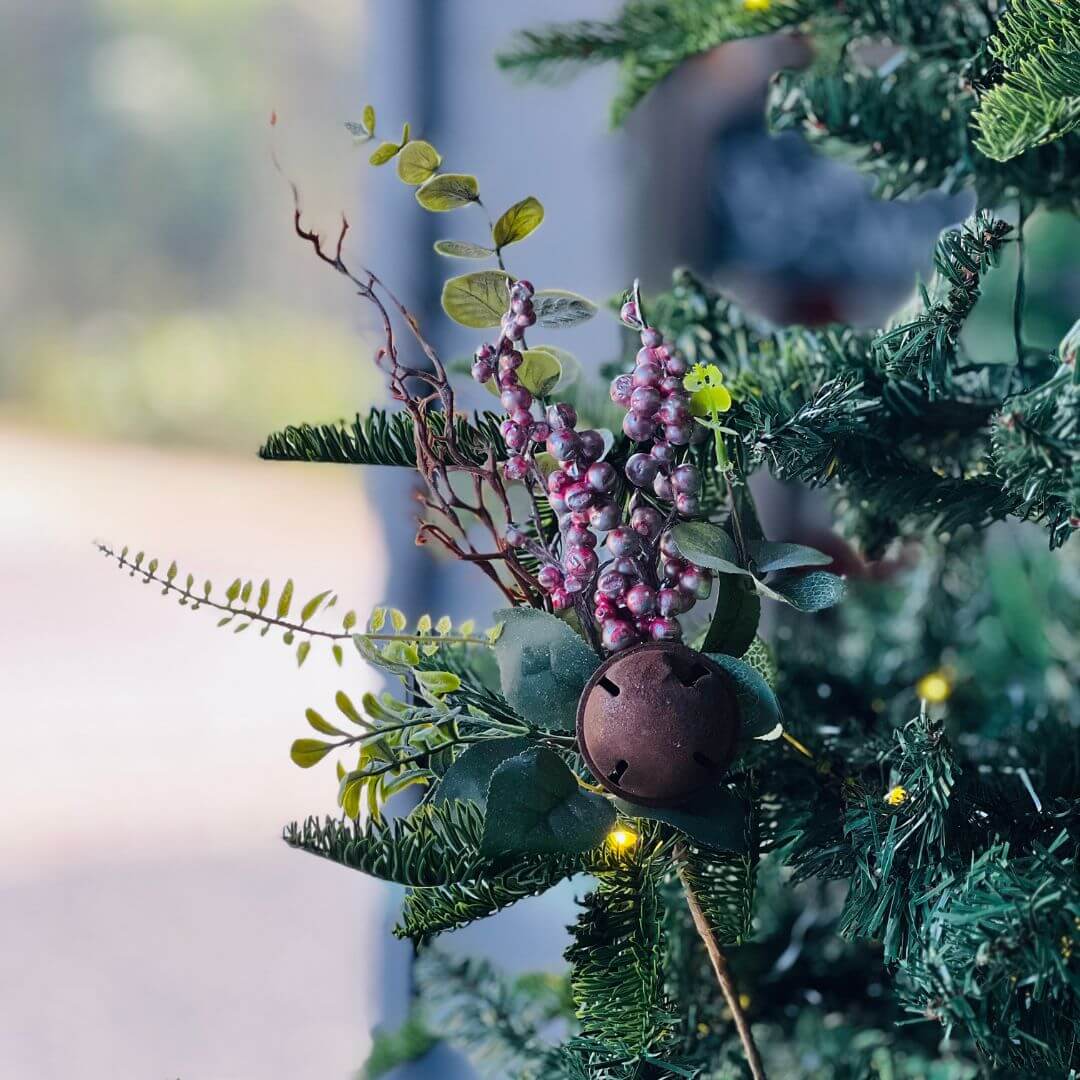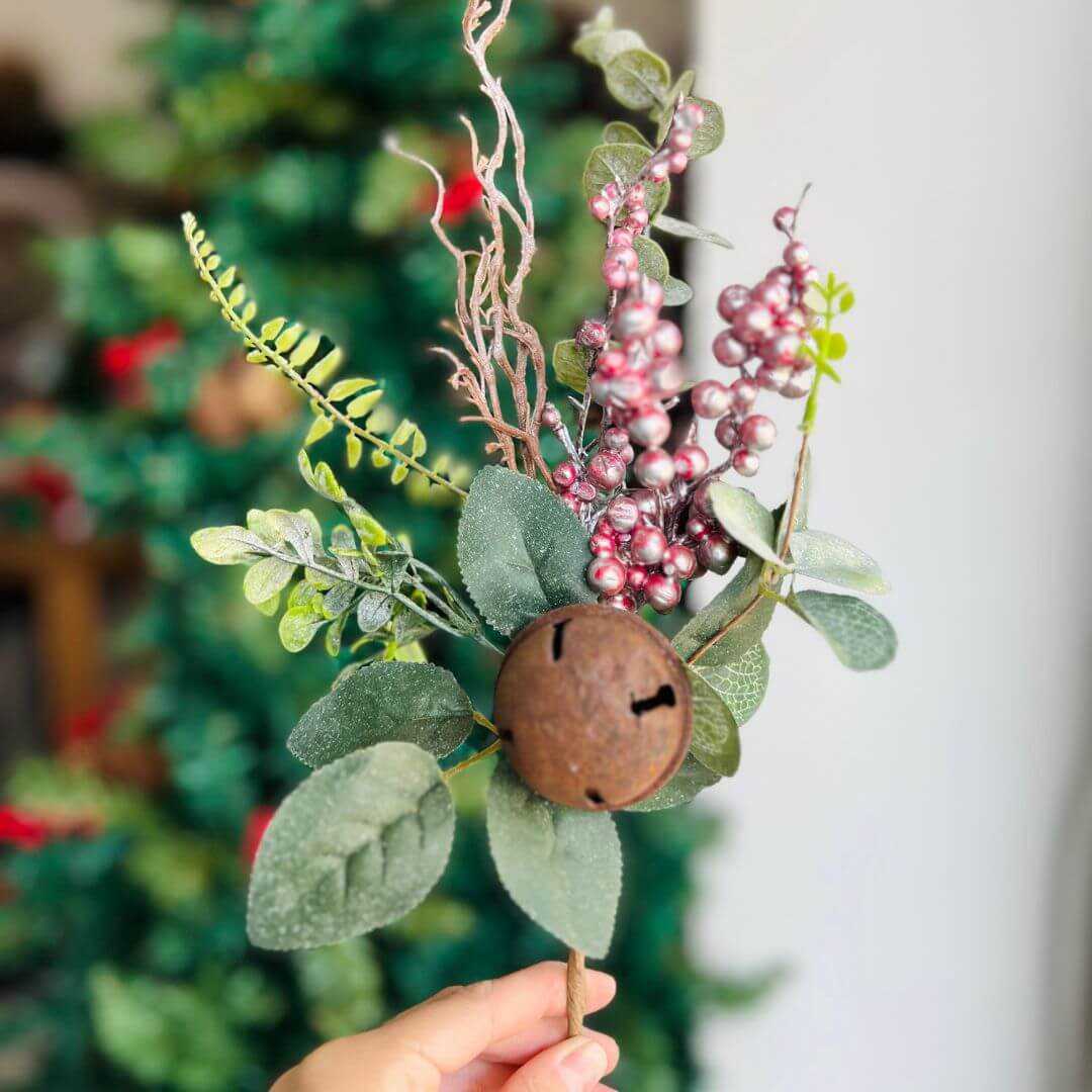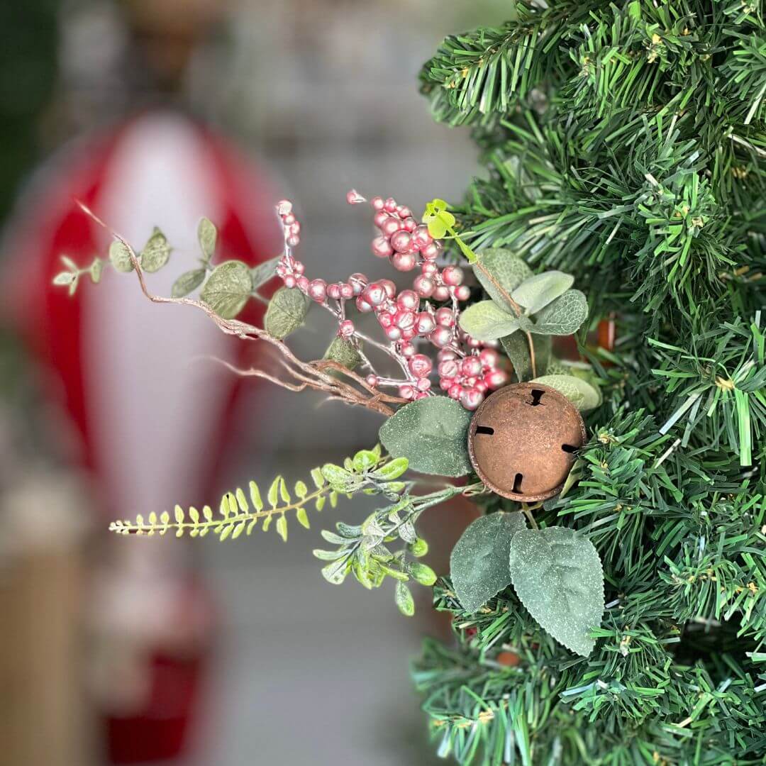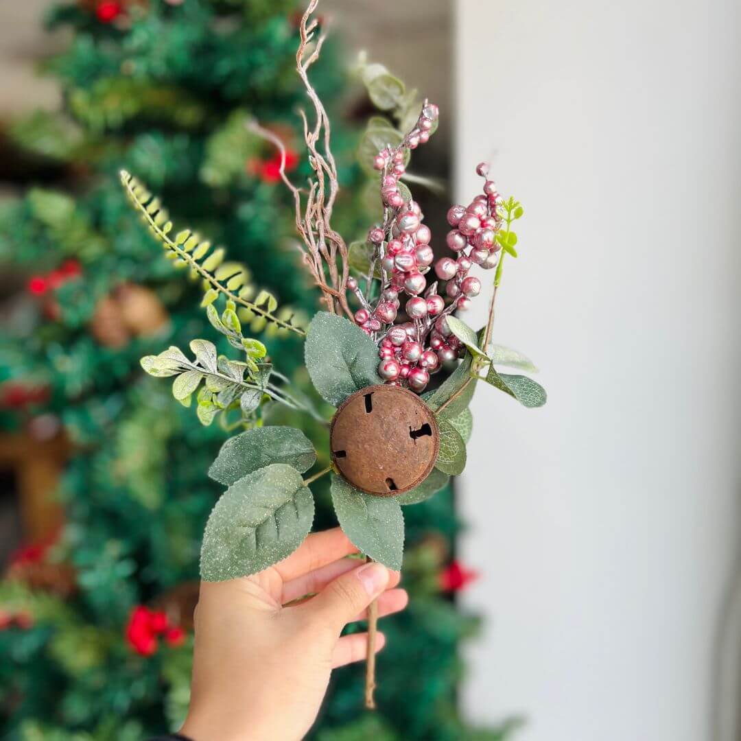 Haste decorativa com pérolas na cor rosê, combinadas com folhagens e pequenos guizos que adicionam charme e movimento à peça. Perfeita para arranjos florais, guirlandas ou decoração natalina, trazendo um toque delicado e festivo ao ambiente. Mede 35 cm.
