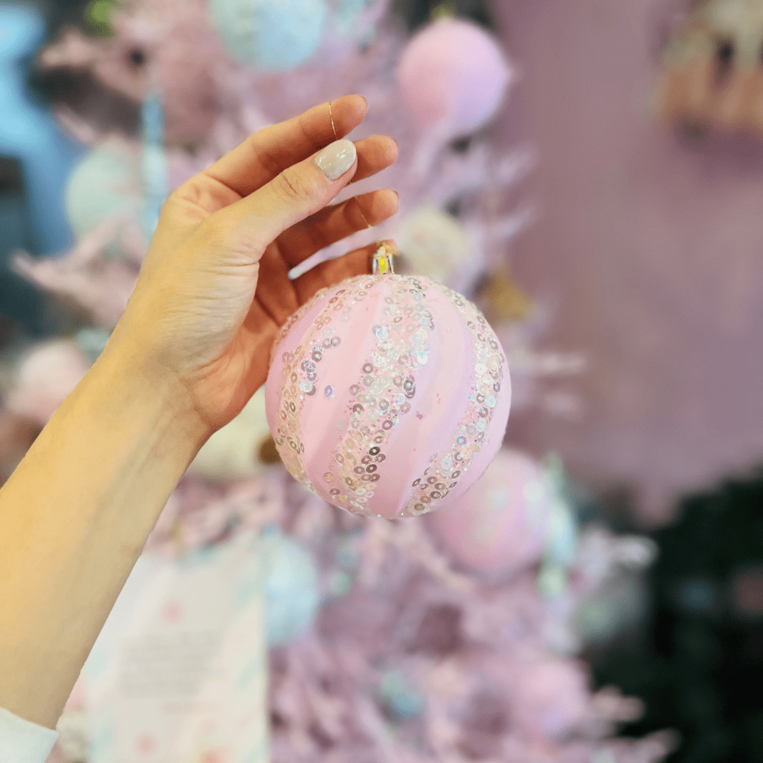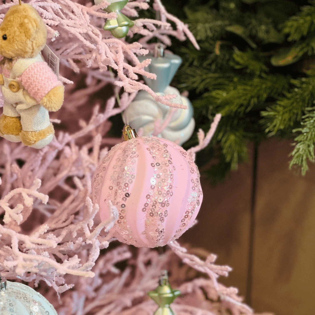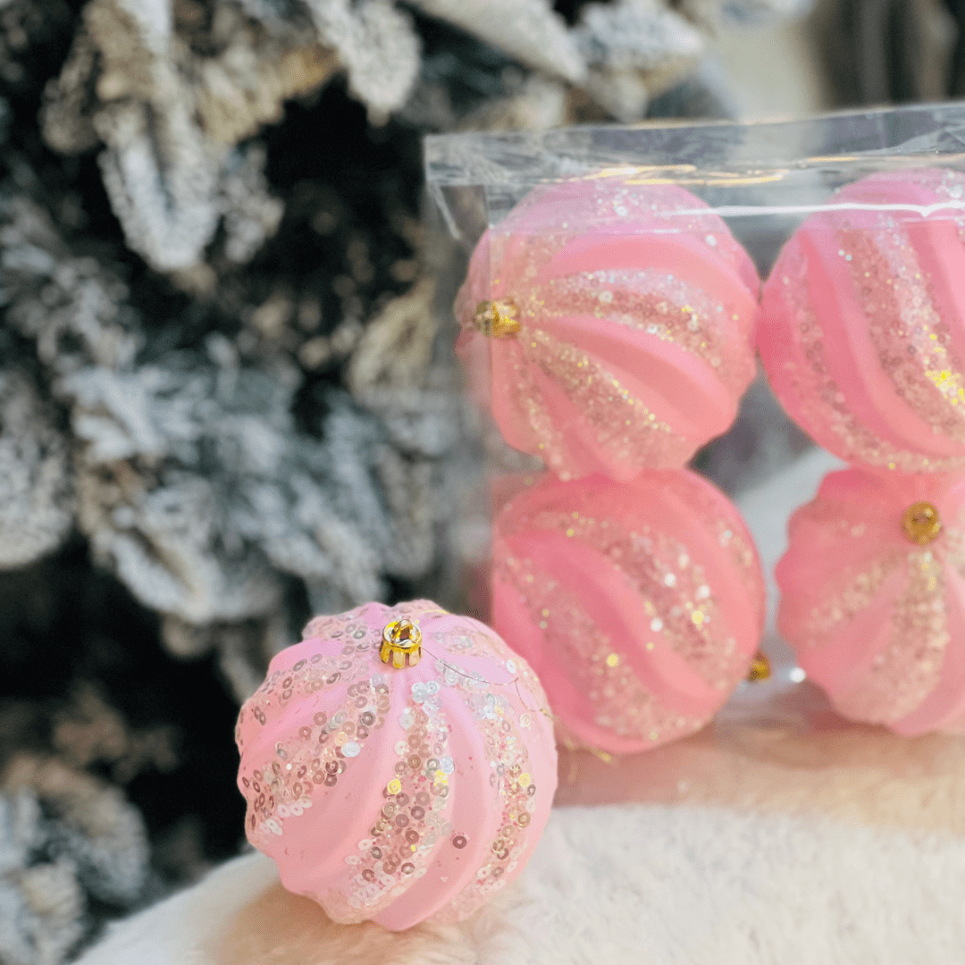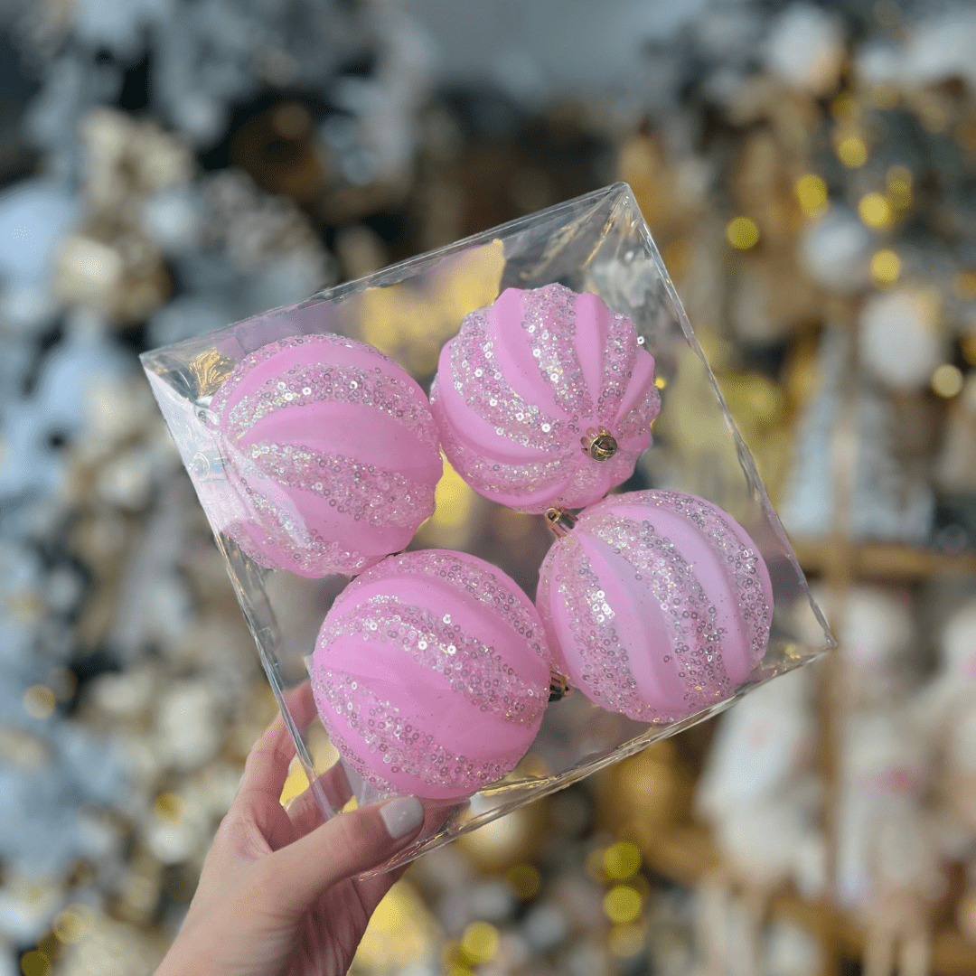 Jogo 4 Bolas Natalinas Rosa Com Listras de Glitter 10cm