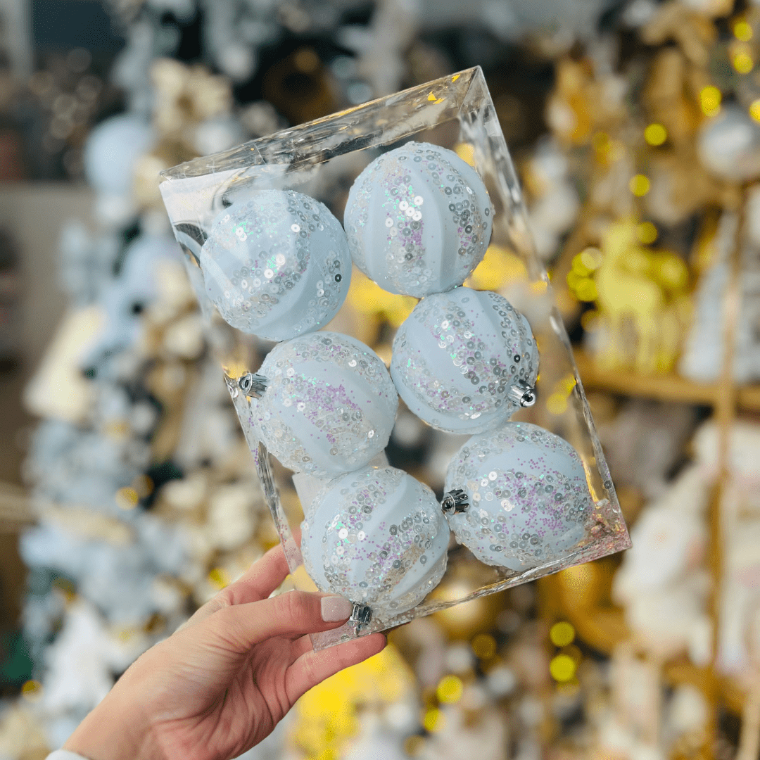 Jogo 6 Bolas Natalinas Azul com Listras de Glitter 8cm