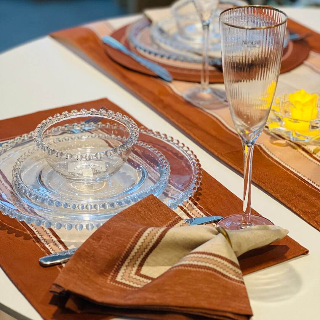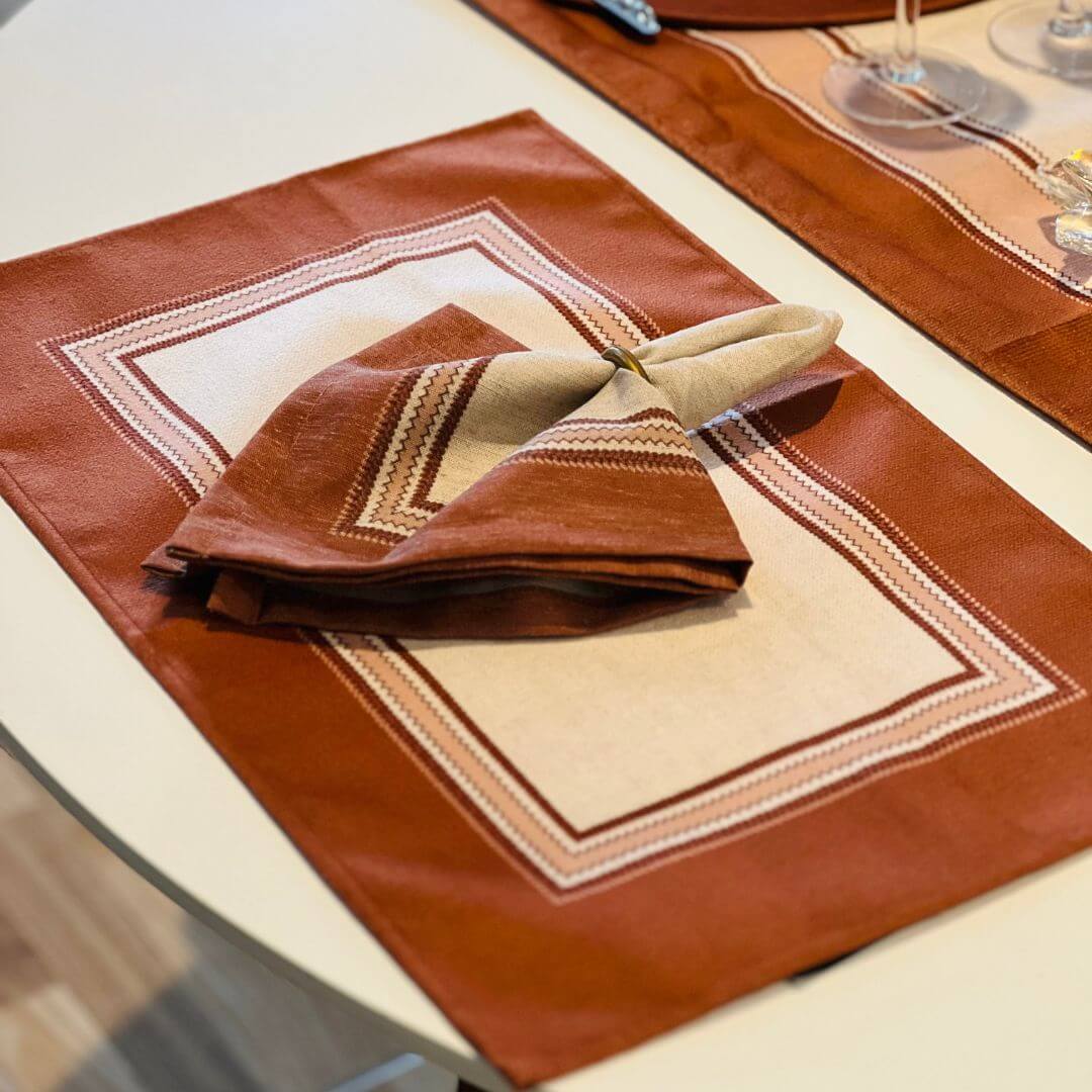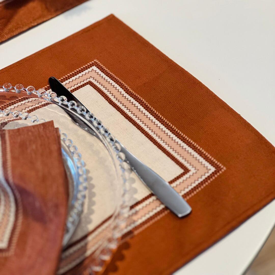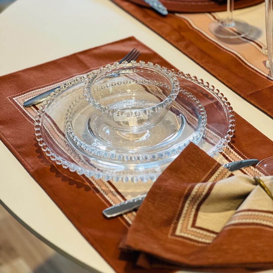 Jogo americano com estampa da coleção Delicadeza Terrena, que combina tons neutros e terrosos para criar uma mesa posta elegante e acolhedora. Ideal para o uso diário ou ocasiões especiais, unindo funcionalidade e beleza na decoração.