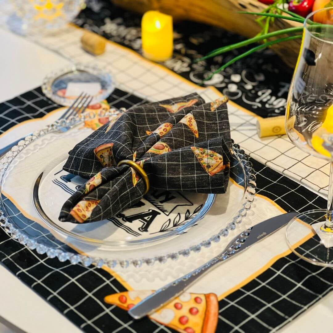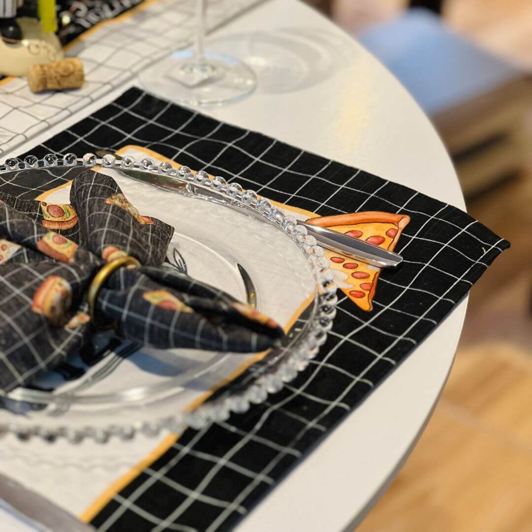 Jogo americano com estampa divertida de pizza, ideal para trazer um toque descontraído e temático à sua mesa posta. Perfeito para refeições em família, encontros informais ou jantares especiais com tema italiano. Protege a mesa com estilo e personalidade.