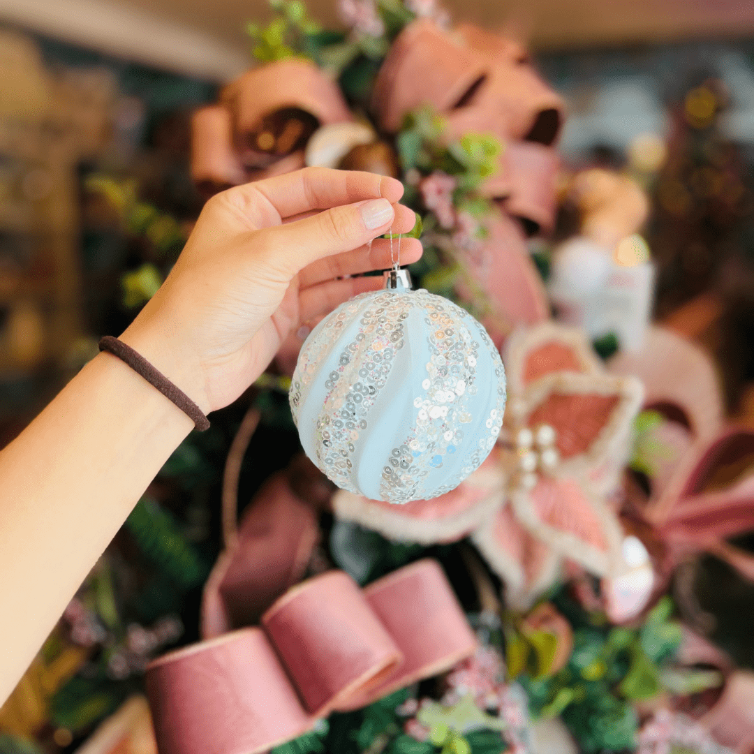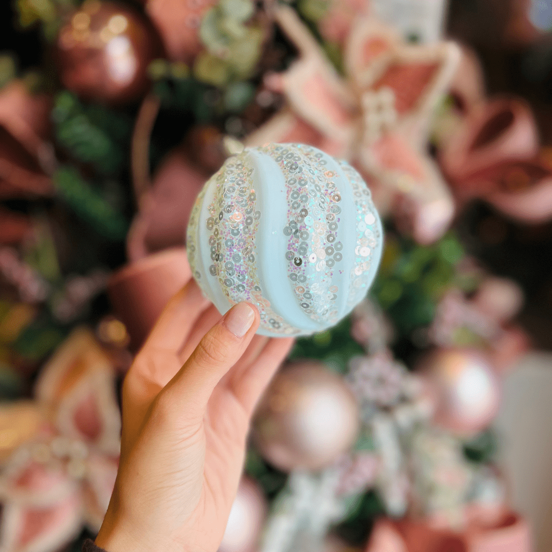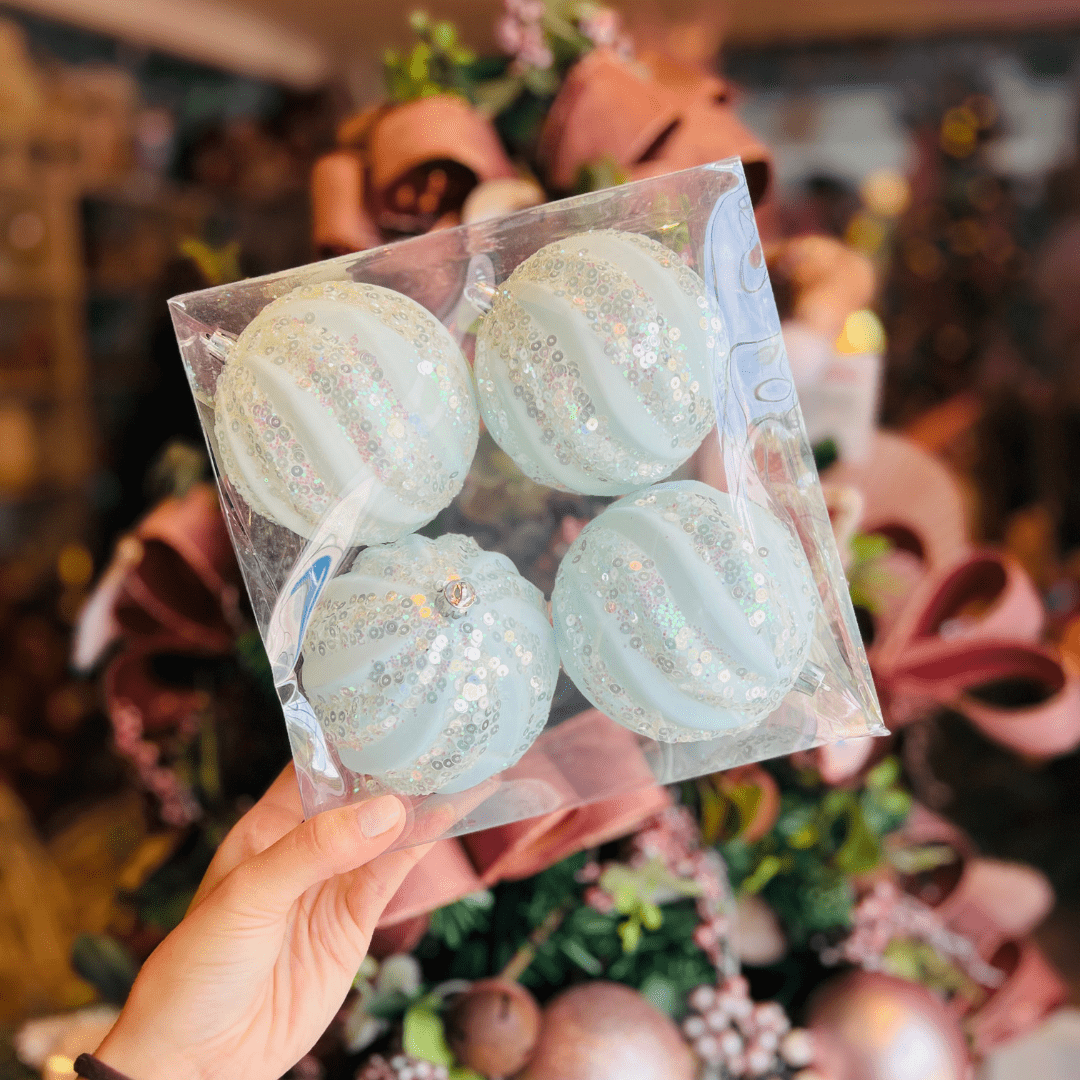 Jogo com 4 Bolas Natalinas Listras Glitter – Azul Claro 10cm